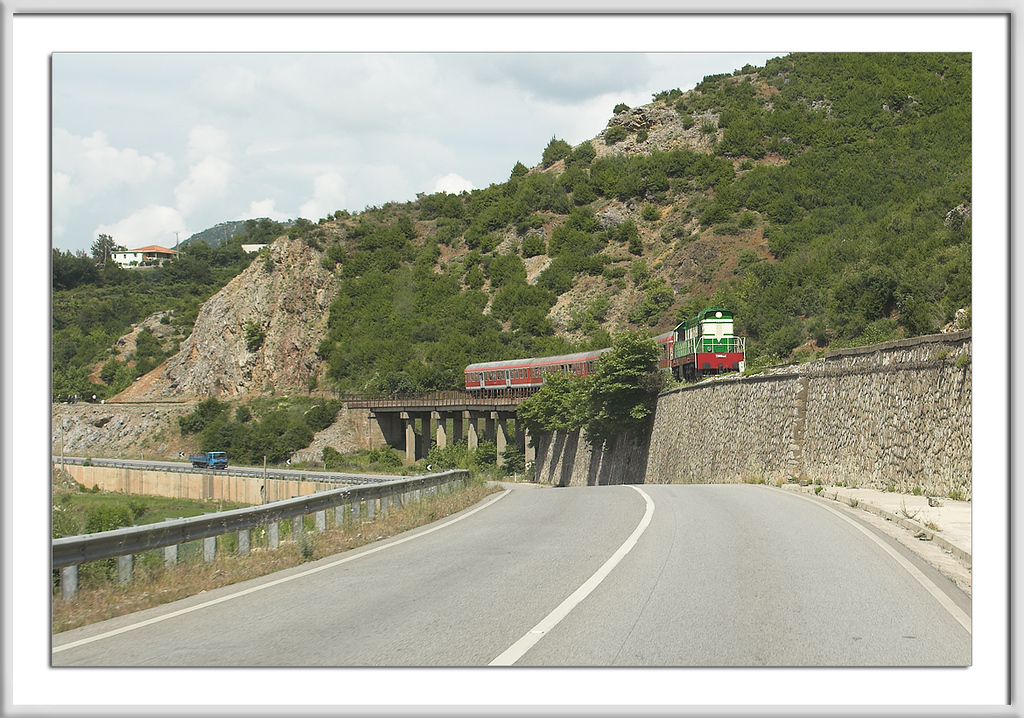 Westlich auf Elbasan zufahrend, hatten wir die Begegnung mit einer farbenprächtigen Eisenbahn.