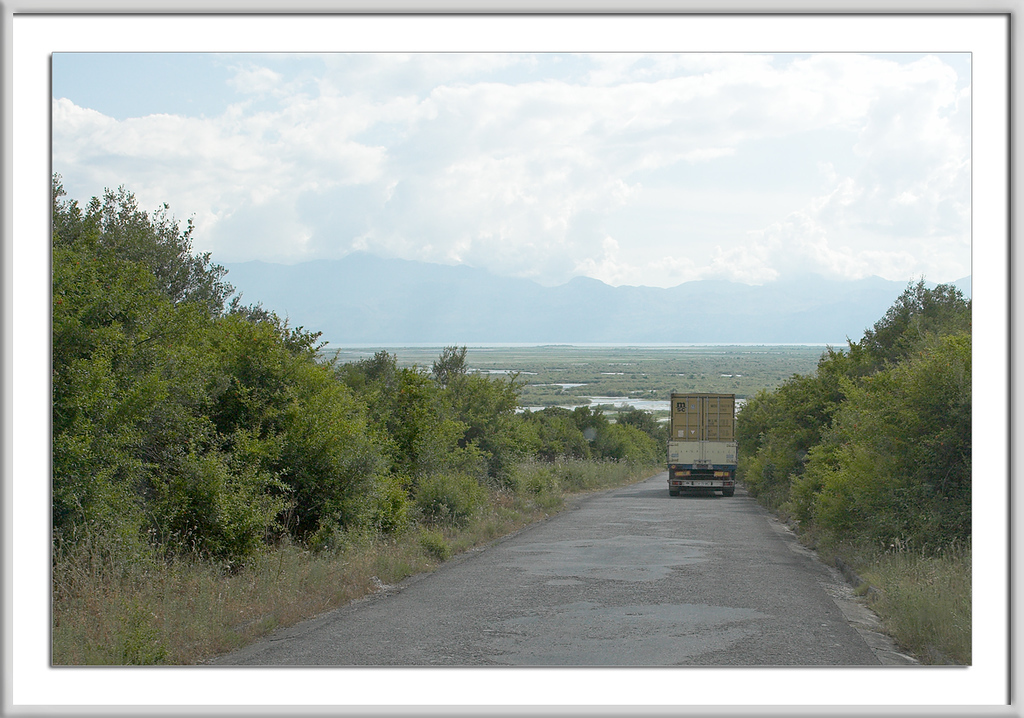 Stimmt, so hat es auch etwas Gutes, daß der Brummer vor uns her fährt, in seinem Windschatten sind wir sicher, gab ich mich zufrieden und genoss die Aussicht auf die versumpften Ufer des Skutarisees