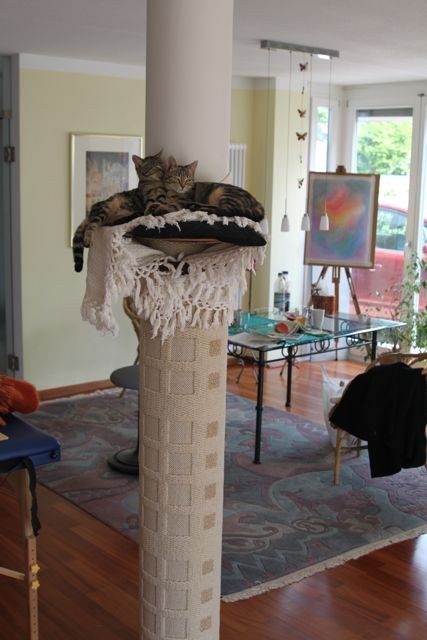 Ich habe heute den Staender des Dinettentisches mit Kokosband umspannt, das ergibt einen perfekten Kratzbaum.