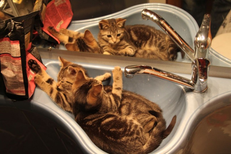 Die Beiden sind wunderschön. Katzen lieben Waschbecken, pass bloß auf, dass sie nicht lernen den Wasserhahn aufzudrehen. Meine Katze entdeckte zuhause die Toilettenspülung, wir mußten die Tür schließen sonst hätte sie den ganzen Tag gespült. :D