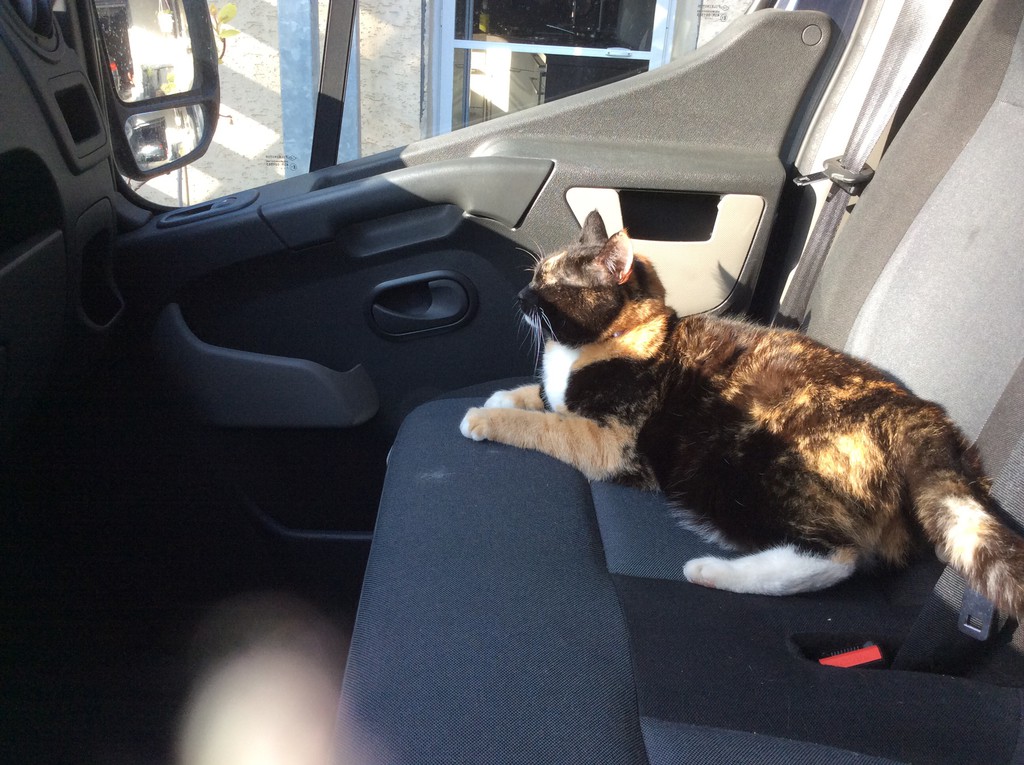 Uma ist die erste die ein- und am Ziel aussteigt. So nach 2-3 Std. Fahrzeit verlangt sie nach einer Pippipause, denn "Frau" kann ja nur auf's Katzenklo wenn wir stehen. :) Manchmal meckert sie am Anfang einwenig aber dann schaut sie aus dem Seitenfenstern.
