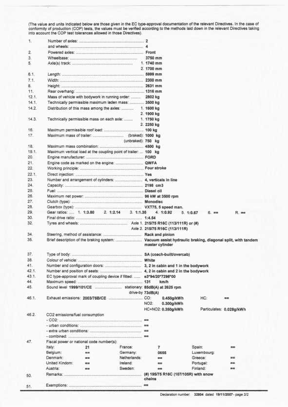 mit Ketten auf Antriebsachse: vorne: 195/75 R 16 C auf Stahlfelge 5,5 J x 16 H2, ET 50 hinten: 215/75 R 16 C ohne Ketten auf Antriebsachse: Vorne und hinten: 215/75 R 16 C Fahrzeug mit Heckantrieb und Zwillingsreifen: ....bitte ergänzen.... Schau mal unter Punkt 32 #und dann unter Punkt 50 der Internationalen Zulassungsbescheinigung!