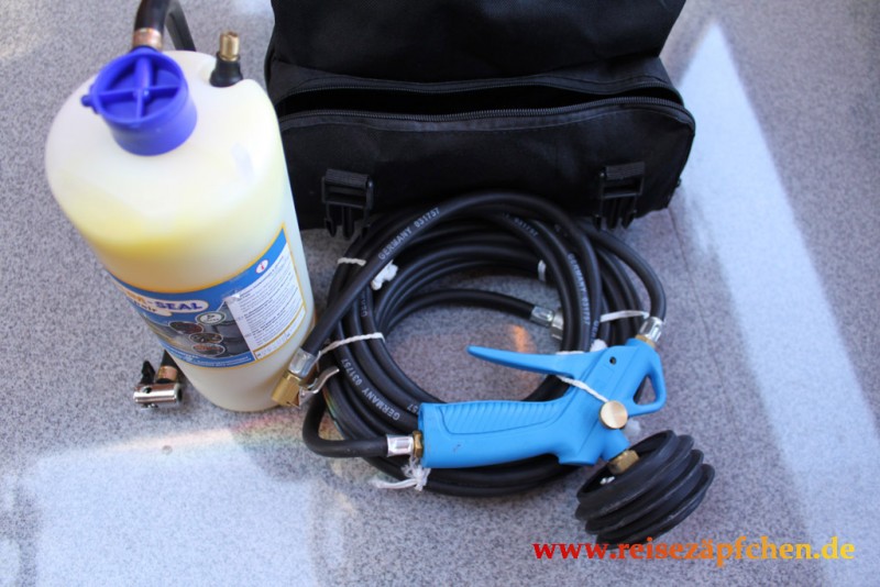 wenns ein relativ neues Womo ist dann liegt das gerät bei dir im auto und nennt sich pannenset(statt ersatzreifen) in der bedienungsanleitung steht schön erklärt wie das ding ohne schaum zu betreiben ist. ps das tire moni ist eine anschaffung die sich lohnt felix Moin,