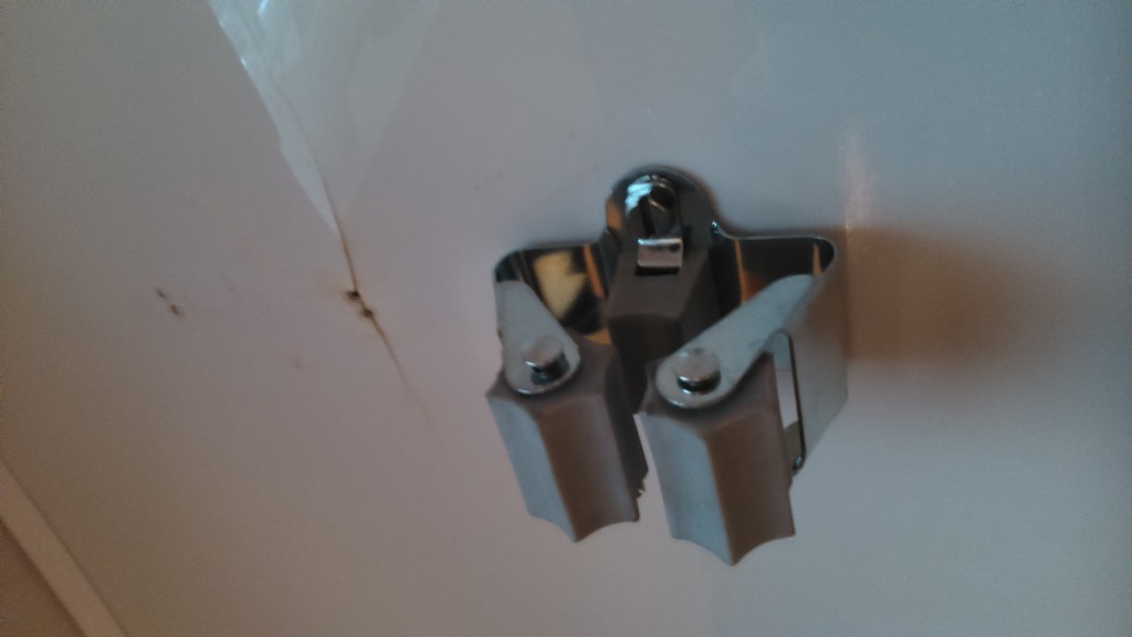Unten an der Tür ist eine Lasche, weiter nach vorne sind zwei Halter die an den Unterboden geschraubt sind. Vorne an der Beifahrertür ist die Schürze nur rein geschoben. Wenn diese drei Schrauben raus sind, kann die Schürze bei halb offener Tür nach hinten und gleichzeitig nach oben geschoben werden. Oben ist sie nur eingehängt, eine Art Keile die an die Wand geschraubt sind (gehen leicht kaputt). , Oskar Dann werde ich auch was beitragen: Beim Kauf unseres WoMo störte mich, das der Vorbesitzer die Duschwand im eingeklappten Zustand mit einem mickrigen Riegel abgesichert hatte. Die Wand klapperte während der Fahrt hin und her und die Duschinnenwand hat durch die zu kurzen Schrauben des Riegels den Kunststoff schon aufgerissen. :evil: ![]() Ich habe aus dem Baumarkt eine Kindersicherungs-Riegel für Schränke und einen Unimet Klemmfix Haken gekauft. Von dem Riegel benötigte nur den einzelenen Halter. ![]() In den Duschwandflügel habe ich den Halter befestigt: ![]() Und in die Wand den Klemmhaken angeschraubt: ![]() Gelöst: ![]() Festgeklemmt: ![]() Jetzt kann man die Duschwand einfach einrasten lassen. Hält bombenfest und klappert nicht mehr. :mrgreen: Die blöden Risse muss ich auch noch weg bekommen...hat einer eine Idee? Carsten hi Kann man da ein Speigel drüberkleben vielleicht..... Schraub das nochmal runter und klebe es mit Flextec Polymer Kleber transparent (Pattex) an und schraube die Schrauben in den frischen Kleber. Dann hält es besser und ist abgedichtet. Auf die Risse kannst du mit dem gleichen Kleber eine dünne Kunststoff Platte aufkleben. Moin ,