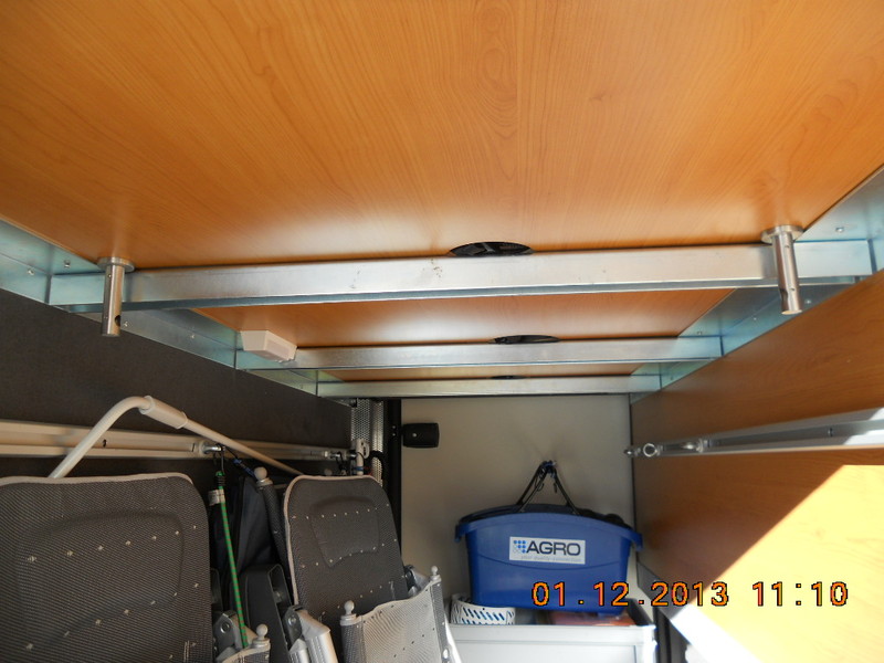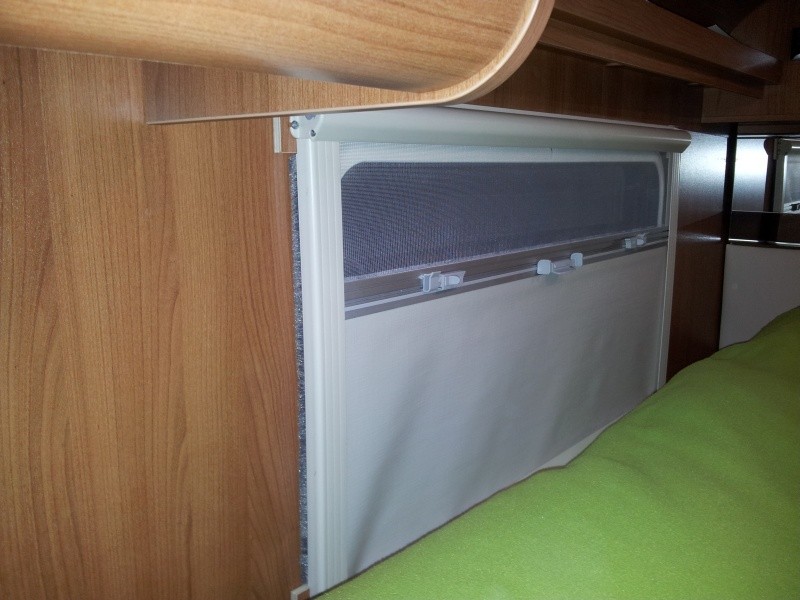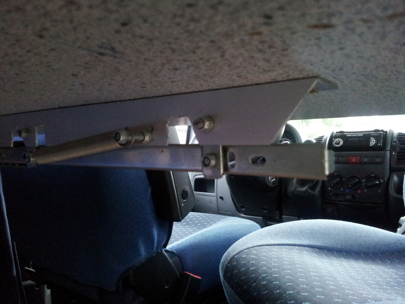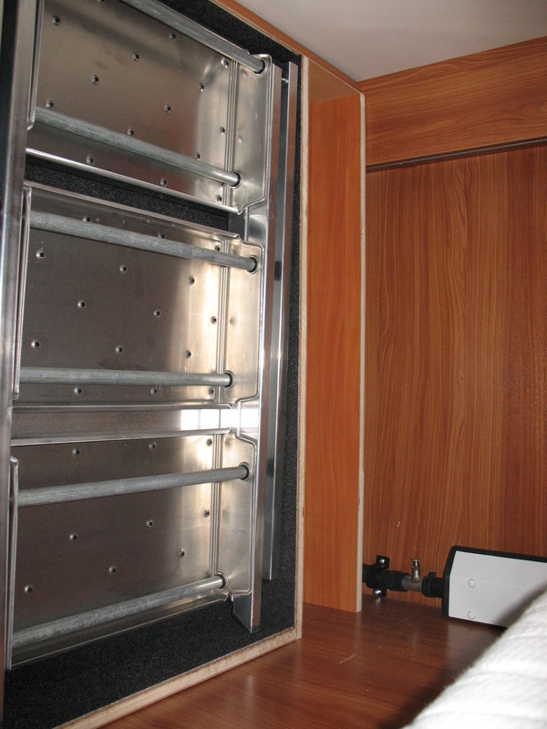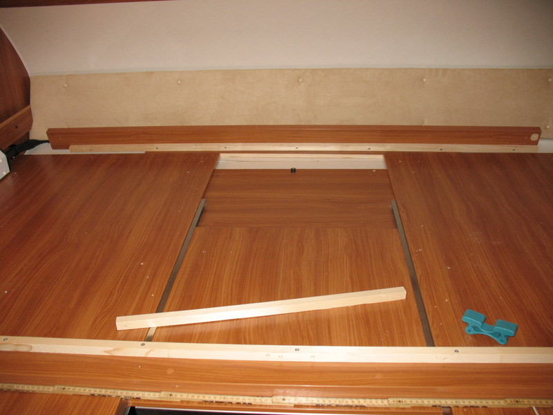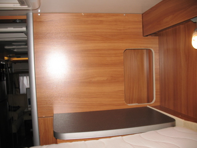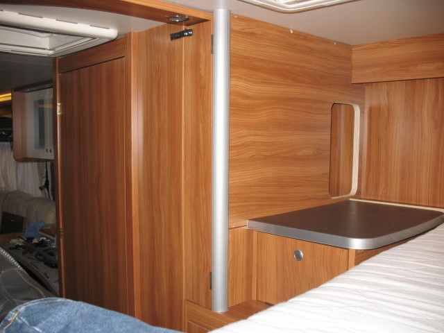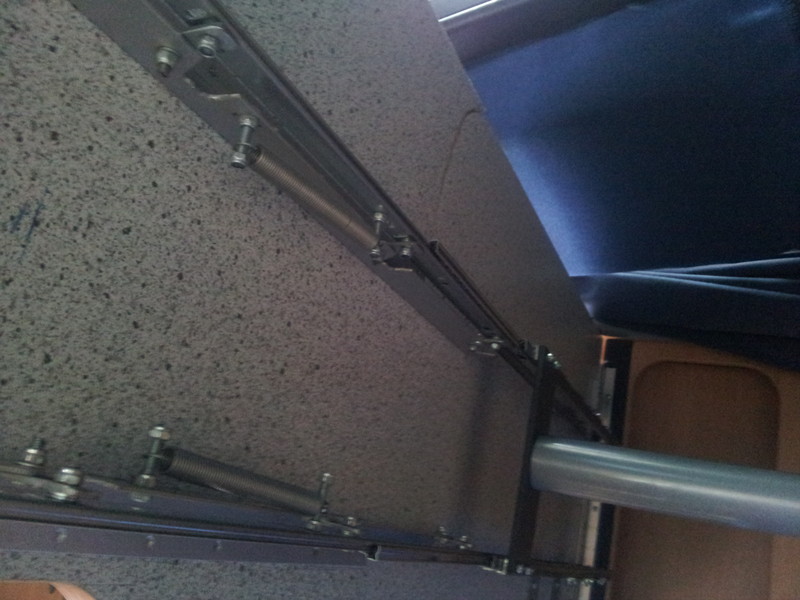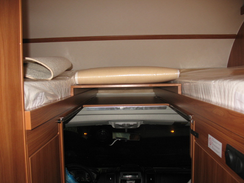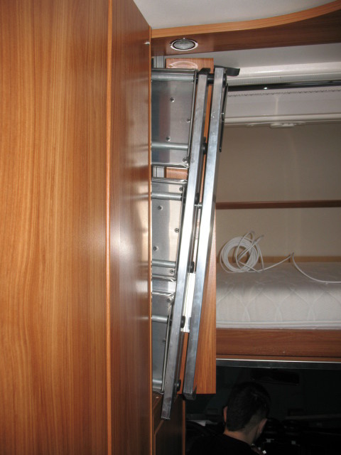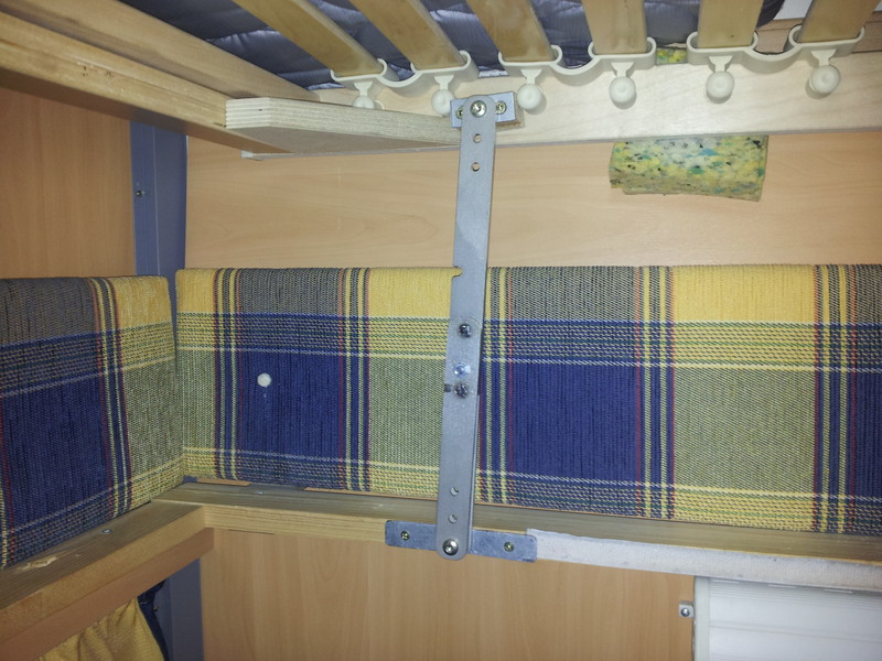 Die Stockbetten in unserem Womo haben eine extrem geringe Kopffreiheit zugunsten einer vergleichsweise großen (hohen) Heckgarage. Da wir meistens nur zu dritt unterwegs sind habe durch einen selbstgebauten Klappmechanismus (Scharnier) das oberere Stockbett um ca. 20 cm höhergelegt um unten eine angenehme Kopffreiheit (auch für Erwachsene !) zu erreichen. Das obere Bett wird dabei vertikal nur von den 4 ausgeklappten Scharnieren und horizontal von sehr festen Schaumstoffkeilen, die zwischen Bettrahmen und Wand geklemmt werden, gehalten (siehe Bild) Das ganze funktioniert wunderbar, das Bett kann dauerhaft auch während der Fahrt oben gelassen aber auch mit wenigen Handgriffen wieder runter geklappt werden.