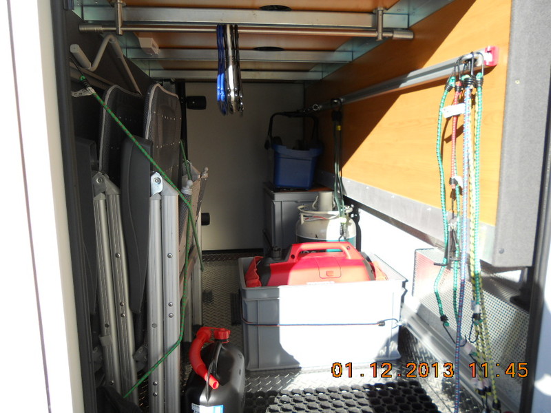 Bei Schmitz in Sprendlingen: Ladebooster, dickere Kabel,mehrere Steckdose, 12 V und 230 V,Solar mit hochwertigem Solarregler, DVBT und Schüssel Caro. Ordnungswand in der Garage, 1Flasche LPG und 1Flasche normal und von Printplot .eu in Polch eine hochwertige Beklebung. Luftfederung im nächsten Jahr. Oh vergessen habe ich Mike Sanders Unterbodenschutz und ein Vorhang vor dem Heckbett und Leselampen unter dem Hubbett vorne auf beiden Fahrersitzen