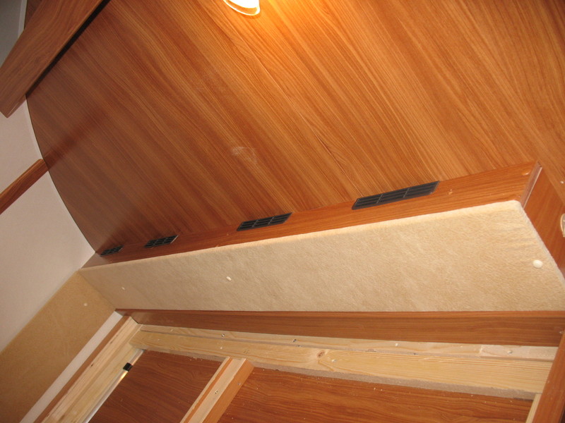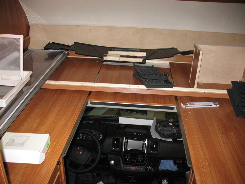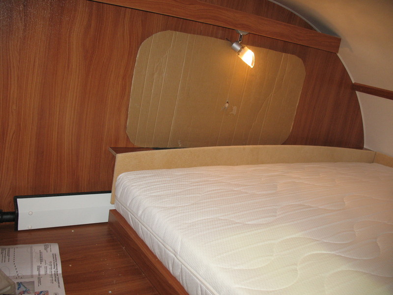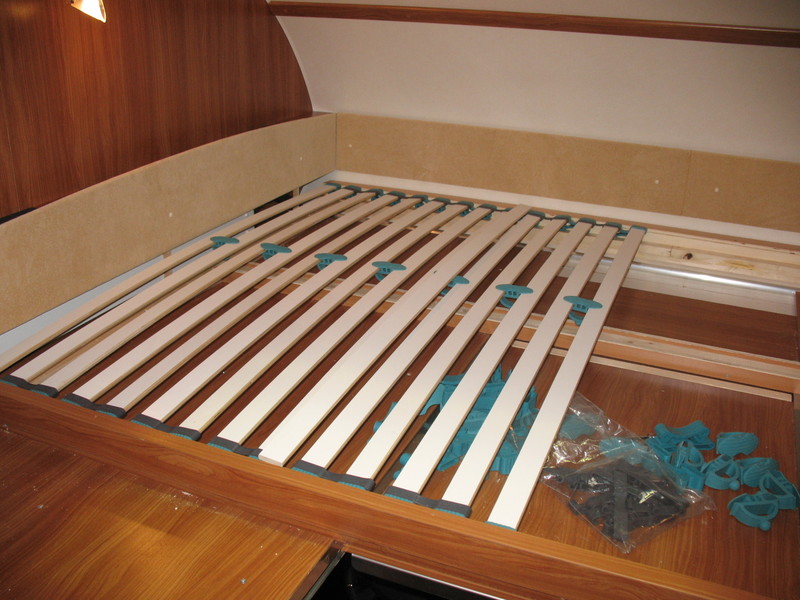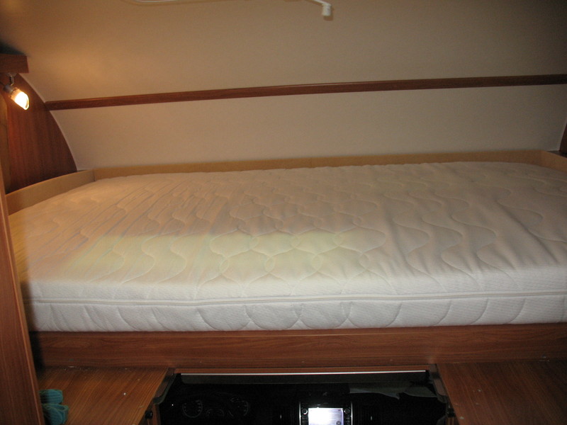 Als erstes kam der Bettumbau im Alkoven, von Einzellängsbetten auf ein Querdoppelbett. Dazu hatten wir bereits bei der Bestellung geordert, dass die ursprüngliche Leiter gar nicht erst eingebaut wird.