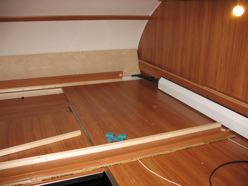 Durch die fehlenden Einzelbetten war nun Platz auf beiden Seiten. Hier wird ein Schrank für die Leiter eingebaut