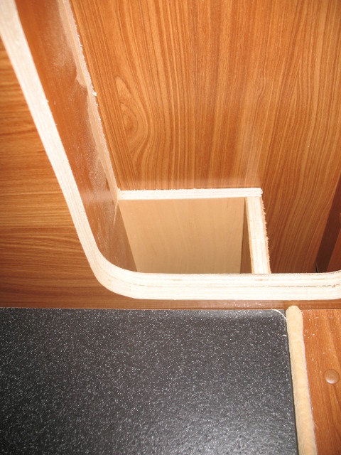 offene Wand zum Leiterschrank nun verschlossen. Davor eine Öffnung für eine Trinkflasche eingebaut und davor ein Nachtschränkchen