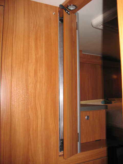 Also, wir haben den alten, verschlissenen und ausgeblichenen Stoff am Alkoven, dem Heckbett und dem Kleiderhaken durch Kunstleder aus dem Bootsbedarf ersetzt. Ferner haben wir die Halogenleuchten durch LEDs getauscht. Zur Zeit baue ich einen Gurtbock entgegen der Fahrtrichtung ein.