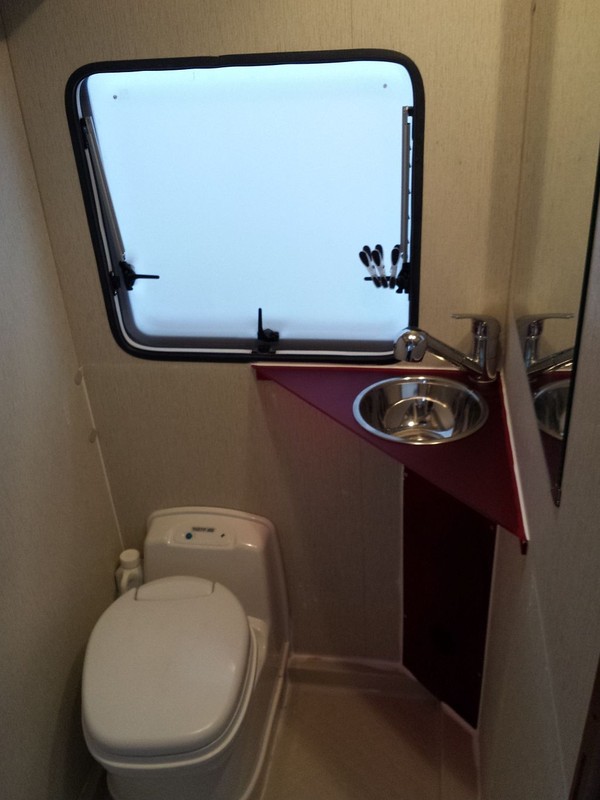 Die Position der Toilette konnte ich nicht großartig ändern, ein Duschvorhang fehlt noch und die Kassette für das Fenster kommt auch in Kürze. Der Fußboden ist aus 4 mm Linoleum.