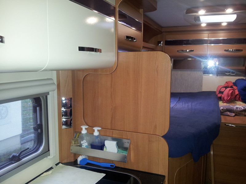 Vor Kopf im Alkoven wurde noch eine LED Lichtleiste verbaut, die per Fernbedienung bedient werden kann. Sie leuchtet in allen möglichen Farben (kann eingestellt werden).