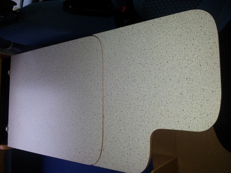 Desweiteren habe ich mich immer über den originalen Esstisch der Halbdinette geärgert, der nur mit einer Einlegeplatte umständlich verlängert werden konnte und unverlägert viel zu lang war um bequem auf den Fahrersitz zu kommen ( Durchgang verengt ) aber auch wiederum zu kurz, um vom Beifahrersitz aus essen zu können. Also habe ich mir mit Baumarktartikeln (Dekorplatte, Tischfuss, stabile Schubladenschienen, Federn und Kleinteilen) und Standardwerkzeug (Stichsäge. Bohrmaschine etc.) einen für meine Bedürfnisse optimalen Ausziehtisch selbst gebaut (siehe Bilder).