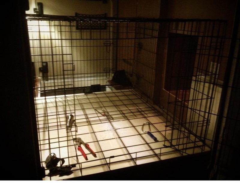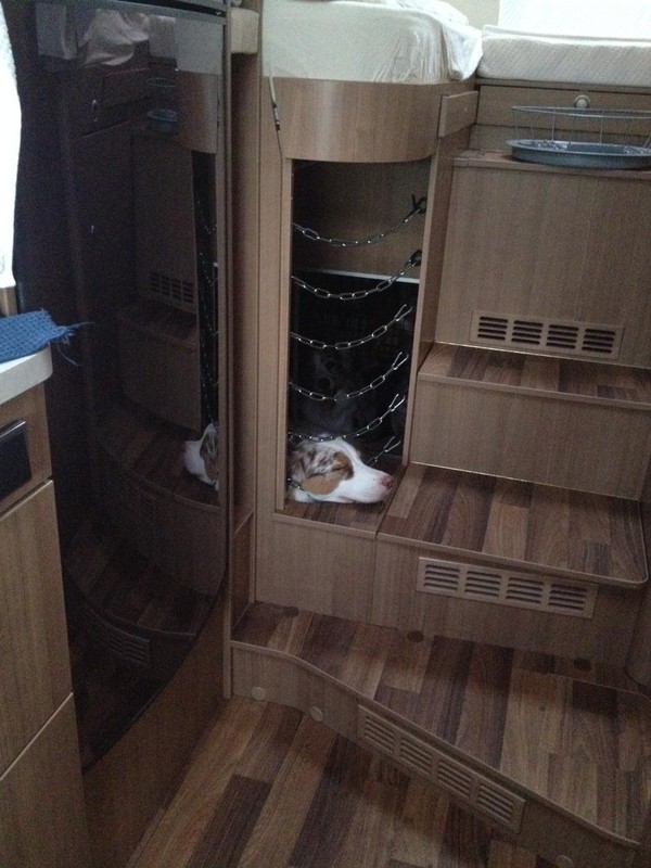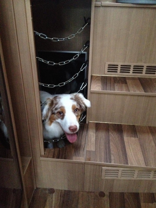 Wir haben die halbe Garage für unsere bislang drei Hundis umgebaut. Mit Durchbruch in den Innenbereich und ordentlicher Sicherung mit Klettverschluss-Schnell-Entriegelung :D