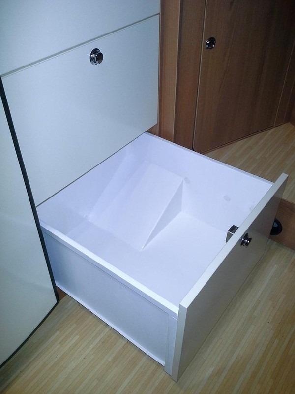 Musst einfach runterscrollen :ja: . Bin immer wieder erstaunt was ihr so zaubert an Euren Mobilen :wink: . Moin Danke! Nee, das ist stinknormales 20mm Styropor. Das tut's vollkommen, der Rest vom Womo hat ja auch "nur" Styro als Dämmung. Wandaufbau: 4mm Sperrholz, Dachlatten, Styro, 4mm Sperrholz. Ich habe etwa eine Dachlatte zugesägt, teils halbiert, die lag hier noch rum, das Sperrholz habe ich im Baumarkt zusägen lassen für 28€ und die Styroplatten (1,5st) lagen auch noch rum, (kosten etwa 3-5€). Verklebt mit Weißleim, den ich auch hier hatte. Die Beschläge haben nochmal 12€ gekostet (3 Scharniere und 2 Schieber, einer je Seite). Die Dichtungen sind aus Tesa-Moll "E-Profil" das auch noch rumlag. Zusammen also etwa 50€ wenn nichts vorhanden wäre. ![]() ![]() ![]() Jetzt fehlt nur noch eine Lasierung, dann ist es fertig. Das kann ich aber erst nächstes Wochenende machen, ich will ja nicht in den Dämpfen schlafen müssen... :roll: Christian :daumen2: :daumen2: :daumen2: Könnte sein das ich zum "Plagiator" werde. :roll: Danke für den Input :top: Hallo, wir haben unser womo ja erst seit Nov.2013, deshalb bisher nur eins verändert. Schubauszug anstatt Fach mit Klappe. Viel bessere Raumausnutzung und bessere Zugänglichkeit. Der Keil hinten Rechts ist die Aussparung für den Radkasten. ![]() Ist alles aus Pappelsperrholz. Boden 6mm, Wände 3mm mit Verstärkungen an den Rändern. Alles weiß lackiert. Jürgen Feines, sauberes Handwerk, Jürgen. :top: