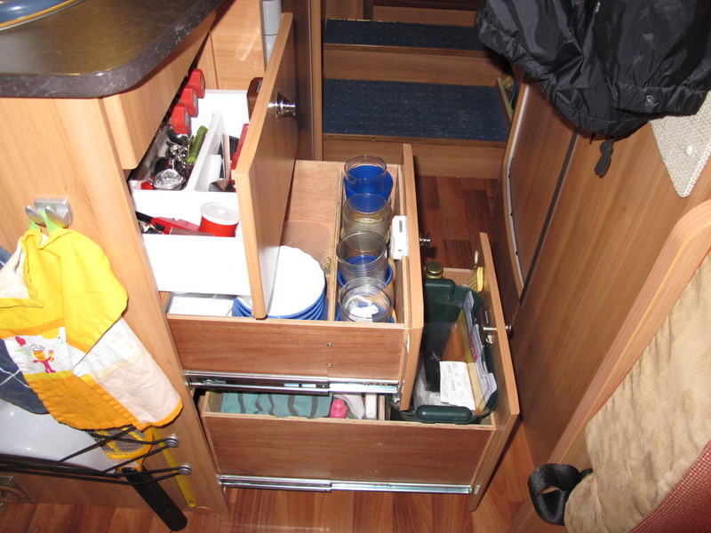 Einspruch! Bitte nicht als PN, mich interessieren solche Lösungen auch! :wink: Hi, ät Jambo45 der Bitte von Frauke schließe ich mich an. Danke lG - Karin Fotos kommen. So, hier ein paar Fotos ![]() Hier das Stapelbox-REgalsystem. Die Boxen sind selbsteinrastend. Sie werden vorn von einer Schlingeleiste gehalten und hinten von einer Leiste nach oben gegen Raushüpfen gesichert. ![]() Im Küchenschrank habe ich die beiden unteren Staufächer zu Vollauszügen umgebaut, dabei die Schranktür zu Schubladenblenden umgearbeitet. Die Schubladen sind exakt für mein Geschir / Abfalleimer / Putzzeug durch Zwischenwände formschlüssig unterteilt. ![]() Das umgebaute Heckkompartment weist links und rechts zwei große Schubladen (60x80x35 cm) auf, dazu zwei Stufenstaukästen. Ganz hinten im Holzdekor der Weinflaschenbunker. Unter de Schubladen je ein Staufach für Schuhe / Wasserflaschen. ![]() Hier die geöffneten großen Schubladen, die voll in den Gang gezogen werden können. Kein Bücken und Kramen! ![]() Zum Schluss die Sitzkiste vorn, die sowohl als Schublade voll ausgezogen und auch nach wie vor von oben geöffnet werden kann. Dahinter verstecken sich WAndler und Elektroverteilung. Schmankerl: Das Heizungsrohr wurde seitlich unten durch die Schublade geführt. ich hoffe man kann alles erkennen. Jan Sachen gibt's ... :roll: Gratuliere. Hast Du die Schubladen komplett neu gebaut? Haste toll gemacht! Von überall Schubladen träumts mir ja auch ;D Moin Jan, also: RESPEKT!!! Bist Du Tischler oder so? Die Schubladen sind ja der Traum einer jeden Hausfrau :) Das Regalsystem in der Heckgarage sieht auch sehr stabil aus, wiegt aber durch die Verwendung von Holz auch ganz gut was, oder? Auf jeden Fall alles super gelungen! Klasse Arbeit, Jan! Sieht alles sehr wertig, aber auch gewichtig aus! Und nach jeder Menge Arbeitsstunden! Ein solcher Ausbau hält wahrscheinlich länger als das ganze Blech drumherum. Respekt! Hallo Eijden, nee, ich bin, du glaubst es nicht, Beamter. Hab aber von meinen Vorfahren eine gute Werkstatt geerbt. Die Umbauten sind übrigens kaum ins "Gewicht" gefallen. Erstens mal habe ich jede Menge altes Material rausgerupft und zur Herstellung der Umbauten wiederverwendet. Komisch, ich hatte hinterher sogar noch was über. Wer diese Möbel am Reißbrett entworfen hat, der hatte alles mögliche, aber keine Ahnung. Die Schubladen sind ultra leicht, weil extrem Dünnwandig. Bodenplatte aus 12 mm Pappelsperrholz, Wände aus 4 mm Gabunsperrholz. Stabilität kommt durch die Fichtenholzleisten in den Ecken, hier wurde geleimt und geschraubt. Das Regalsystem ist ebenfalls aus leichtem Sperrholz. Unter dem Strich dürfte ich mit Schubladen kaum schwerer sein als vorher ohne. Und ich behaupte, wenn man meine Konstruktion gleich serienmäßig machen würde, wäre der Möbelbau einfacher und unterm Strich nicht teurer. Ich musste jetzt etwas Sperrholz kaufen, dazu die Vollauszüge, die mit 17,-€ pro Schublade zu Buche schlagen. Ja, und etwas Leim, Spaxschrauben und vier zusätzliche Schubladenschlösser. Nicht der Rede wert. Liebe Jan Hallo Jambo45, ich glaube diesen Fahrzeugtyp hatte ich auch mal. Hier ein paar alte Bilder von den Umbauten. ![]() ![]() Beheizung Beifahrerseite ![]() Beheizung Fahrerseite mit dem Heizungsschlauch zum Armaturenbrett ![]() Zusatzlüfter im Sitzkasten mit Verteilung nach vorn ![]() Lufteinlass Armaturenbrett rechts ![]() Tresor rechts vom Beifahrer unter einer Klappe und rechts die Luftverteilung zum Armaturenbrett ![]() ![]() ![]() Umbau der Luftzufuhr Uwe Hallo zusammen, nach nun einem Jahr haben wir einiges verändert : Knaus Sky ti 650mf 2012 Fahrerhaus Decke Re+Li Zig.Steckdosen Innenrückspiegel demontiert und Navi dort montiert Ersatzrad TV raus TAB rein Flaschenregal über Radkasten links eingebaut Schuhregal über Radkasen rechts eingebaut div. Filzstücke verarbeitet gegen rappeln Schutzgitter Kühler Alle Lampen auf LED umgerüstet Tiefe Sitzkonsole Fahrerseite Tiefe Sitzkonsole Beifahrer Bat.+Ladegerät versetzt von Fahresitz zur Sitzgruppe hinten HeoSafe Und in kürze erhalten wir eine neue Aufbautür der Firma Tegos, Termin steht :D an alle Moin Habe heute endlich die langersehnte Trennwand eingebaut. Nie wieder Hechtsuppe durch den doofen Vorhang wenn es draußen kälter wird. ![]() ![]() Davor habe ich noch einen Ölwechsel gemacht, waren schon wieder über 10tkm in den letzten 3 Monaten... Christian ...vergessen: Die fertige Wand wiegt 4,2 kg und ist nur mit 6 Schrauben fixiert, kann also innerhalb einer Minute Rückstandsfrei ausgebaut werden. Christian