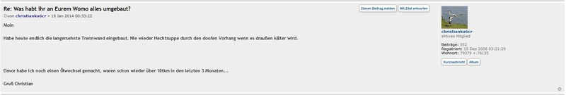 Das war's ! Habe kürzlich einen Werbeblocker installiert, aber im Traum nicht gedacht, dass der auch Bilder schluckt! Rolf Moin Scheint wohl der Link in den Bildern zu sein, der einen immer auf die Startseite des Forums schickt. Wäre also leicht zu beheben von den Admins, aber naja, leider ist man hier oftmals nicht sehr interessiert an problemloser Nutzung wie ich schon mehrfach feststellen durfte... :oops: Christian Hier noch ein Bild von aussen: ![]() Habe gerade gechekt ob irgendwo Licht durchfällt, also ob alles dicht ist ;) Christian