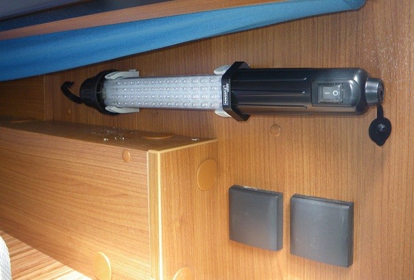 Falls das jemand nachbaut: montiert die Klemmen nicht zu weit auseinander. Die Lampen variieren in den Maßen. Ich hab gerade eine Li-Akku Lampe gekauft, deren Leuchtbereich ist etwas kleiner und ich muß jetzt einen der Halter versetzen. Ansonsten hat es sich als recht praktisch herausgestellt. Die Beleuchtung der Garage ist eher mau, aber dafür kommt man schnell ran, und bisher wurde sie auch nicht von der Ladung beschädigt. RK