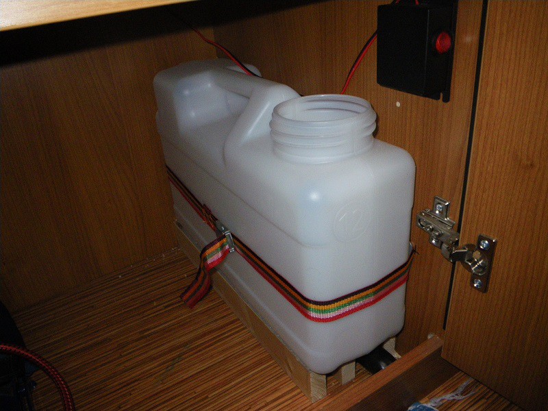 Dem Wassertank und Leitungen traue ich da nicht, obwohl sie regelmäßig gereinigt werden, von der Qualität des eingefüllten Wassers, Schlauch etc. ganz zu schweigen. Außerdem bleibt das Wasser aus organisatorischen Gründen oft auch im Sommer wochenlang im Tank. Vermutlich wäre es genießbar, aber das ist mir nicht sympathisch. Daher der getrennte Trinkwassertank. Bisher war das ein 5l(?) Flextank, der im Bad stand. Aber zum einen stört er dort manchmal. Zum anderen ist das Wasserentnehmen nicht so prickelnd. Ich hab ihn dann im Bad aufgehängt, aber man sollte vor Fahrtbeginn nicht vergessen, ihn wieder abzunehmen. Deswegen wollte ich eine Lösung, die nicht im Weg ist, leicht zu bedienen und schnell überall zu füllen und zu säubern. Mit dem Schlauch kann ich oben im Küchenbereich bequem einen Topf einfüllen. Andererseits kann ich alles bis auf die Anschlußbox sofort herausnehmen. RK