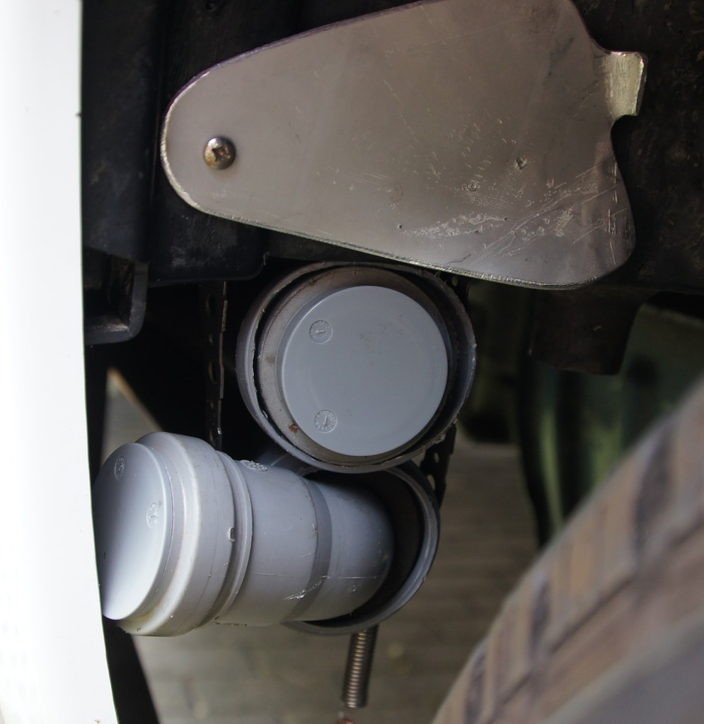So, nun habe ich meine "Sünden" abgearbeitet. Zunächst die provisorischen Gummi-Stöpsel für die Grauwasser-Schläuche. Danke an Jochen für den Tip mit den Endkappen, wußte nicht das es die in so klein gibt. Sieht jetzt wesentlich besser aus, oder? Die Sicherungs-Platte ist etwas demoliert weil mehrfach auf dem Schraubstock umgeformt wurde. Hoffe keiner schaut mir in den Radkasten. :razz:
