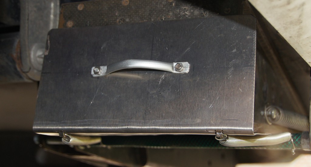 Doppelbodenraumbeleuchtung (durchgehend)auf 12V Netz u. mit konventionelle hellen Sofittenglühbirnen 2x 10W/Einheiten ,(flache Standardlampen /Campinghandel) für breite Ausleuchtung. Projektiert Klappenschalter, im Augenblick Schiebeschalter an den Leuchten hinter den Klappen. Gr. Richi