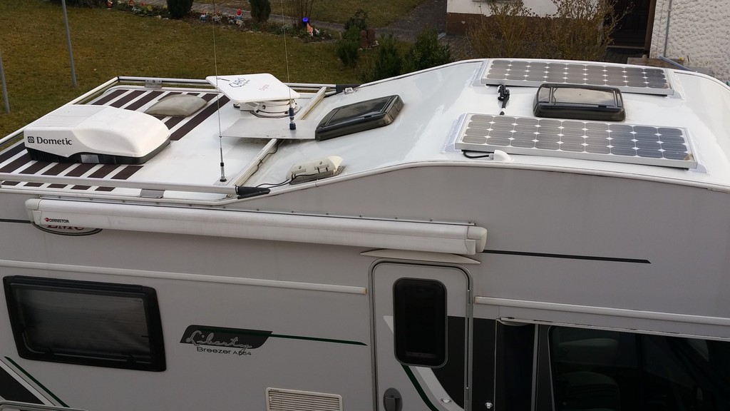 im Augenblick noch für TV-, CB- und Telefonantenne - meine Lösung sieht so aus. Später soll da noch 'ne nette 2-mtr.-Antenne drauf. Die Aluplatte ist mit 2 eloxierten Alu-U-Schienen verschraubt (Edelstahlschrauben) und mit Sika aufs Dach geklebt. Die IP-65-Dose ebenfalls. Schöne vom Mobil-Meister