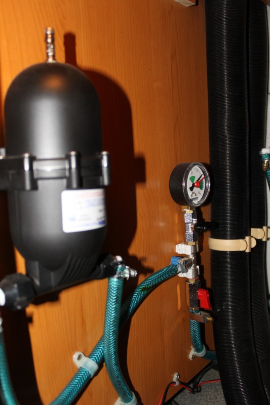 Ansonsten handhaben wir es in unserer Kiste auch so, das die Pumpe nur eingeschaltet wird, wenn jemand Wasser benötigt. Nachdem auf einer Fahrt mal jemand vergessen hatte den Wasserhahn in der Küche richtig zu schließen und der geschlossene Stöpsel einen ordnungsgemäßen Ablauf verhinderte, schwappten mir bei einem Bremsmanöver mal einige Liter Wasser nach vorne in den Fußraum. Das passiert mir nie wieder. Zu jedem Systemcheck bei einer Abfahrt gehört seitdem auch die Kontrolle des Pumpenschalters. Longo: Ich weiß nicht , ob bei einer Druckanlage ein Rückschlagventil viel Sinn macht, denn eine intakte Pumpe soll das doch wohl von alleine regeln.