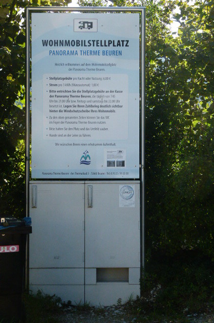 die therme hat nun auch einen wohnmobilstellplatz, auf den jedoch nicht per wegweiser hingewiesen wird. ich habe die therme einfach angerufen und danach gefragt. der - allerdings ziemlich kleine - stellplatz befindet sich am oberen ende der goethestraße (für´s navi), direkt neben dem parkplatz für die mitarbeiterinnen und mitarbeiter der therme. eine nacht kostete 6 EUR. mit der bescheinigung, dass man den obulus bezahlt hat, bekommt man zwei schlüssel ausgehändigt - einen für den stromkasten (1 EUR für 3,5 kW) und für die mülltonne. für die beiden schlüssel sind 20 EUR kaution zu hinterlegen. hier bilder vom stellplatz: stromkasten und mülltonne
