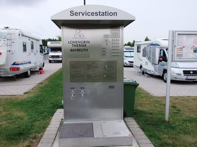 Sehr schoener Platz, thermalwasser in Trinkmenge kostenlos in der therme zu den Oeffnungszeiten, da schmeckt der Kaffee! Der Bus in die Stadt direkt vorm Stellplatz faehrt sehr oft, mit Tagesticket ueberall hin. Fragt an der Thermenkasse nach Brot, mit Thermalwasser gebacken und sehr lecker. Gute cafeteria in der therme, ein Bereich von aussen in Strassenkleidung zu nutzen. In der therme gute Angebote zum kostenlosen mitmachen, macht rundum Spass dort. Ist das ein offizieller Stellplatz mit oder ohne V+ E und Strom? Servus ja der ist ofiziell direkt neben der therme strom wird von einer zentralanlage gesteuert bzw.betrieben (echt ein wahnsinn was die da investiert haben ) v-e Ach du jeh, jetzt faellt es mir wieder ein!!!, Ist der Frischwasserhahn immer noch direkt neben der Cassettenspuelung? Dann fragt bitte alle und so oft nach, bis der Frischwasserhahn auf die Seite oder weit nach oben verlegt wird. Mir wurde gesagt, das sei von womoprofis geplant und ich soll das so gut finden. Tu ich aber nicht. Ansonsten ist es wirklich gut da, toller Winterplatz. Auch über 10 Jahre später ist hier noch alles gut. Das einzige das Anlass zum Meckern gäbe, ist dass man zum Grauwasserentsorgen einen Schlauch braucht. Preis aktuell 15 € und man bekommt aber 10% auf den Eintritt in die Therme. Bayreuth selbst ist zwar eine kurze Autofahrt entfernt, man kann direkt vom Stellplatz aber schön die Eremitage erwandern. Rechts im Bild die Plätze mit Strom, links die ohne. Hier sieht man schön die Entfernung zur Therme Die Servicestation leider mit komisch hochgesetztem und nicht wirklich anfahrbaren Grauwasserablauf. |