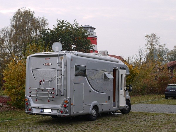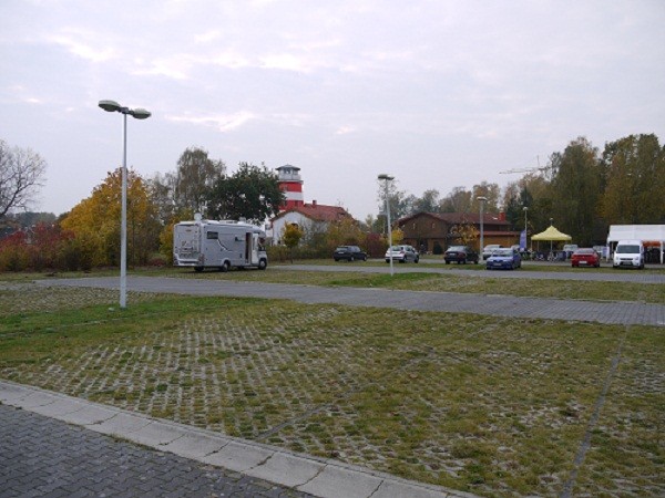 Vor dem Saunapark befindet sich ein großer befestigter, beleuchteter Parklplatz ohne V&E und ohne Strom.