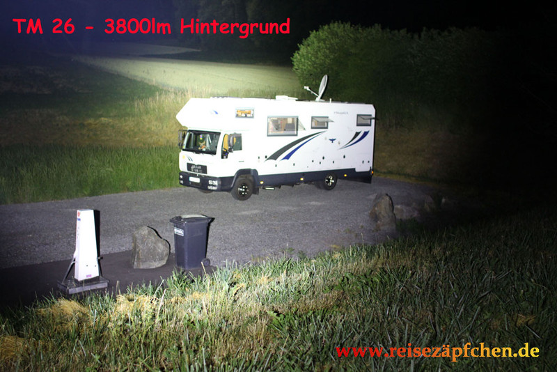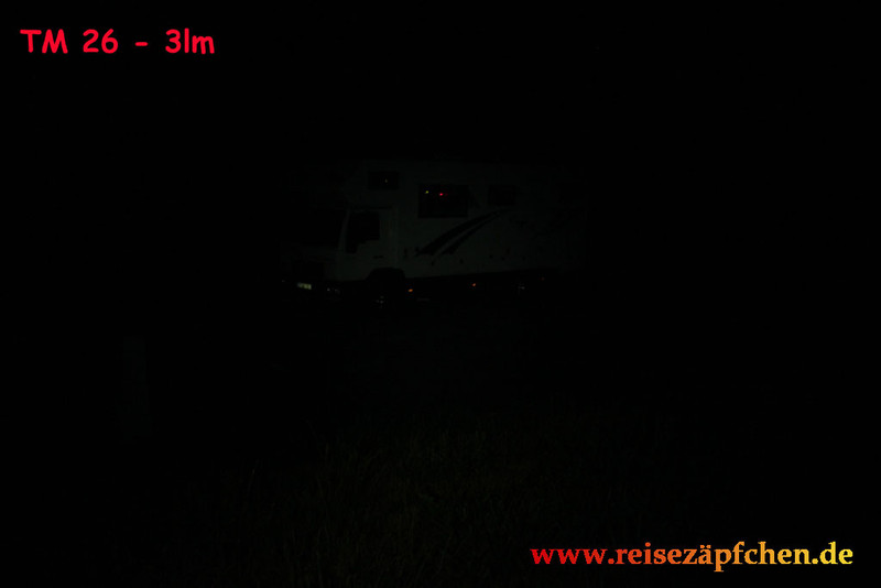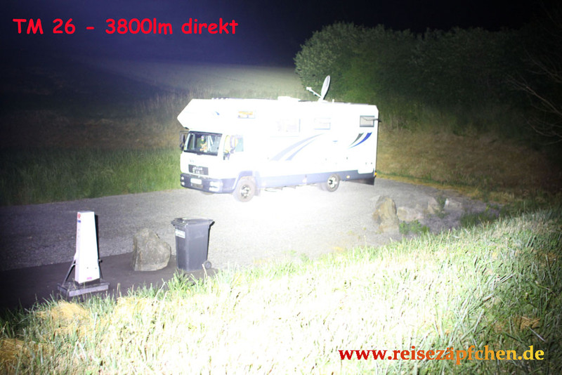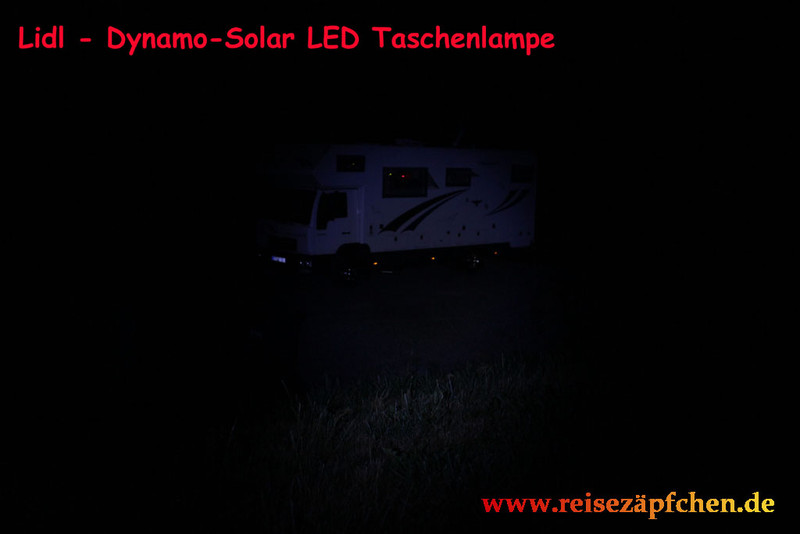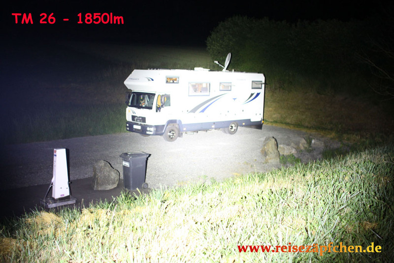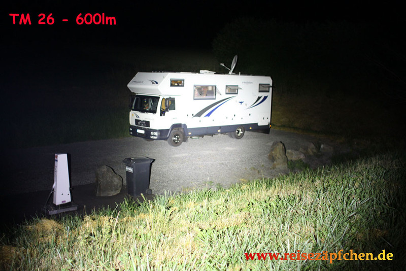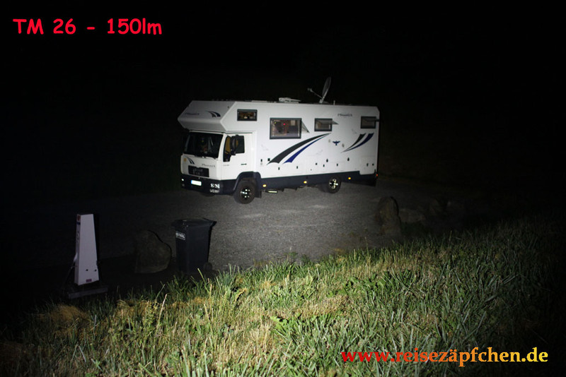 wahrscheinlich hat Wolfgang die Ente abgeschossen, ist doch Jäger [quote="Administrator"] ok, Danke für die Information :) Ich habe nochmal was vorbereitet, extra fürs Forum ;D Wir haben ja mittlerweile einige LED´s an Bord, nicht nur im Womo, sondern auch als tragbare Taschenlampe. Nur war ich das ewige Herumgefunzel leid, wenn man mal etwas Licht in der Natur benötigt. Also musste ein kleines handliches Taschenlämpchen her: Die NightCore TinyMonster26, man kann es auch als Flaggschiff bezeichnen ;-) Aber der Reihe nach, erstmal auspacken: ![]() Praktisch: 12V-Ladekabel, zum Laden kann der Wechselrichter ausgeschaltet bleiben Vier Spezial-LED (CREE XM-L2) bringen es maximal auf 40W LED-Power. Das ist ungefähr mit dem Xenon-Fernlicht eines PKW vergleichbar. Dafür müssen auch gescheite Akkus den Strom liefern: ![]() Zum Vergleich links ein normaler AA-Akku Jeder der 4 Akkus liefert eine Spannung von 3,6V und hat eine Leistung von 2900mAh, diese werden parallel verschaltet. Die gesamte Ladetechnik befindet sich im Lampengehäuse. Der Clou: Über das eingebaute Display wird man detailiert über den aktuellen Lade- und Entladezustand der Batterien informiert, außerdem zeigt es Temperatur, Laufzeit und die Helligkeitsstufe an: ![]() Und hier mal noch ein Größenvergleich mit den restlich vorhanden Taschenlampen, bevor es ein paar Testbilder gibt: ![]() ![]() Für die Testreihe wurde gleich mal der Stellplatz beleuchtet. Die Canon-Kamera EOS 500D mit aufgesetztem Weitwinkel-Objektiv 24mm 1,4L und folgenden Einstellungen dokumentierte das Ganze: Belichtungszeit: 0,3 Sekunden Blende: 2,2 ISO: 800 Automatischer Weißabgleich Die Kamera auf ein Stativ geschraubt und schon konnte es los gehen: ![]() ![]() ![]() Die 3 kleinen Taschenlampen bringen alle eine ähnliche Beleuchtung zustande, wobei die Dynamo-Solar Lampe noch das hellste Licht liefert. Auch die größte Leuchte von IVT macht ein nicht wesentlich helleres Licht im LED-Modus: ![]() Im Halogen-Modus sieht man mit der IVT schon um einiges mehr, wenn da nicht der Stromverbrauch und der punktuelle Leuchtkegel wäre. Von der Lichtfarbe jedenfalls angenehm: ![]() Nun kommen wir zum eigentlichen wasserdichten und stoßfesten Test-Taschenlämpchen, der NightCor TM26. Hier kann man zwischen 5 Helligkeitsstufen wählen, die dunkelste Stufe (3lm) ist für die ersten 3 Kandidaten schon fast die Hellste: ![]() Dann geht es los und es ist Schluss mit lustig ;-) ![]() ![]() ![]() Das waren die ersten 4 nacheinander schaltbaren Leuchtstufen, die hellste Stufe mit eine Lichtleistung von 3800 Lumen wird über einen separaten Tastendruck aktiviert: ![]() Damit es nicht ganz so blendet, mal etwas den Hintergrund beleuchtend: ![]() Fazit: Sicher gibt es noch hellere Taschenlampen, aber die sind dann entweder nicht mehr handlich oder preislich in einer anderen Liga, wobei die TM26 auch kein Schnäppchen ist. Das bekannteste Spielzeug ist ja immernoch die berühmte "Wicked Lasers The Torch" mit der man sogar Eier braten kann. Die NightCore bringt es aber auch schon auf ca. 50-60°C Maximaltemperatur, da wird es schon ordentlich warm. Aber es geht ja nicht um Wärme, sondern um Helligkeit und da würde ich die NightCore Tiny Monster 26 jederzeit wieder kaufen. Ach ja der Preis liegt so um die 3,75€ (müsst halt nur das Komma bisschen verschieben)