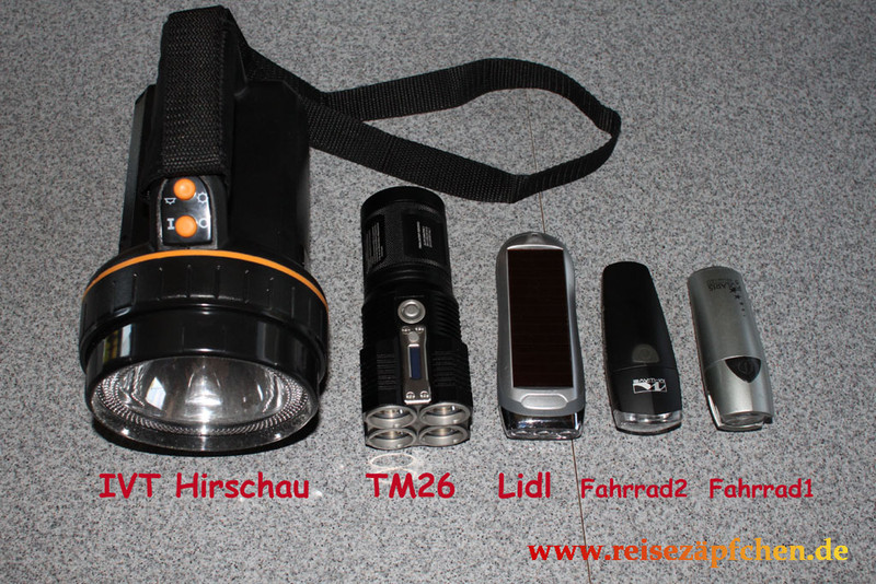 Noch weniger wollte ich auch nicht ausgeben, das ist es mir dann doch nicht wert :lol: Alter Schwede :eek: :eek: :eek: :eek: Ist schon Wahnsinn, welche Fortschritte die LED Technik in den letzten Jahren gemacht hat. Ja, ist es. Und die TM26 - von der ich bisher nichts wusste - ist natürlich schon der Hammer. Vielen Dank, schnatterente, schöner Bericht. Man kriegt das Ganze inzwischen aber auch günstiger, wenn auch nicht unhandlicher und nicht in so einem schönen Gesamtpaket. Ich habe mir inzwischen eine Ultrafire XML-T6 geleistet, mit verstellbarer Optik. Gibts inzwischen für 20€ bei Amazon. --> Link Und Kopflampen gibt es inzwischen auch die um die 1000 lm bringen, bei meiner steht 1600 drauf, weiss nicht wirklich was rauskommt. Ist jedoch irre hell, auch im Vergleich zu den anderen LED Lampen die ich so habe: --> Link Bei der TM26 hat man eben 4 davon...... Bei den 18650 LiON Akkus muss man aufpassen, habe welche in der Bucht gekauft die 5800 mAh versprachen, habe aber nur um die 600 mAh gemessen. Habe reklamiert, und auch Geld zurück bekommen. Panasonic und Samsung machen gute Akkus bei denen die 2900 mAh dann auch wirklich drin sind die draufstehen.