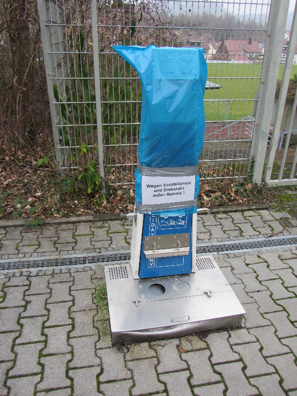 Bestimmt 5% Steigung (gefühlsmäßig), der ganze Platz. Schade. Und im Augenblick wegen Diebstahl und Vandalismus kaum benutzbar ![]() ![]() 6 Stellplätze längs auf PKW Parkplatz, sind aber aktuell weiterhin nicht eingezeichnet und werden deshalb von PKW bei Veranstaltungen komplett belegt. Es ist der Parkplatz der Sportanlage / Hallenbad / Sporthalle / Gaststätte. Es wird eine Gebühr von 3.-€ erbeten, zu zahlen in der Gaststätte Rebblick, dafür auch Nutzung des WC wärend der Öffnungszeiten. VE funktioniert wohl wieder, dafür keine Bezahlung mit Geld mehr sondern mit Wertmarken (erhältlich im Rebblick oder im Rathaus). Preis war nicht angeschlagen, gefragt habe ich nicht. Gebe den Vorredner recht, das Gefälle ist nicht ausgleichbar. Da hätte mal lieber vorher einer gefragt, bei der Auswahl des Platzes. |