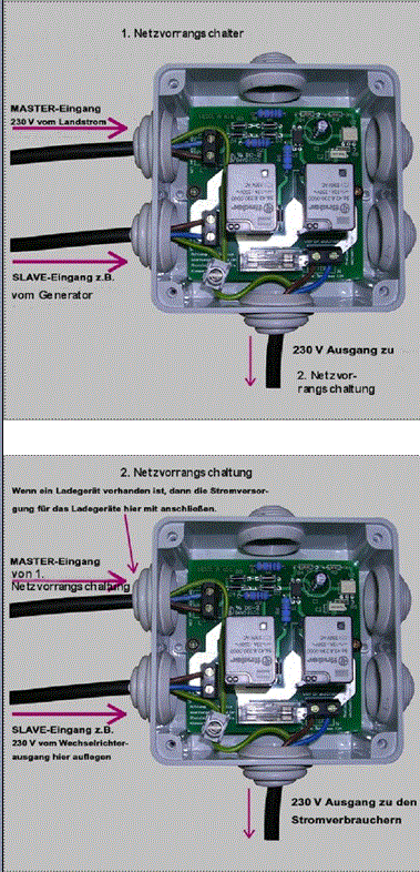 das kabel für dein ladegerät anschliessen ansonsten versucht dein WR deine batterie zu laden . ich hab mir die umschltbox von fraron oder elekto brandstötter montiert und beim umschalten mit dem schütz ist es das problem das er nicht verzögert umschaltet :D Hallo habe folgende Frage zur Netzvorrangschaltung: