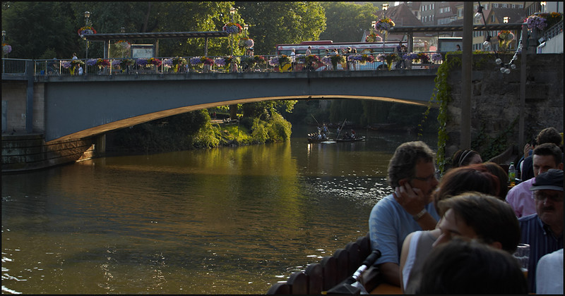 Im Biergarten angekommen gab es den sauer-verdienten Wurstsalat, gekrönt von einer super kühlen Radler-Halben; beim Genießen kann man den Stocherkähnen zusehen: