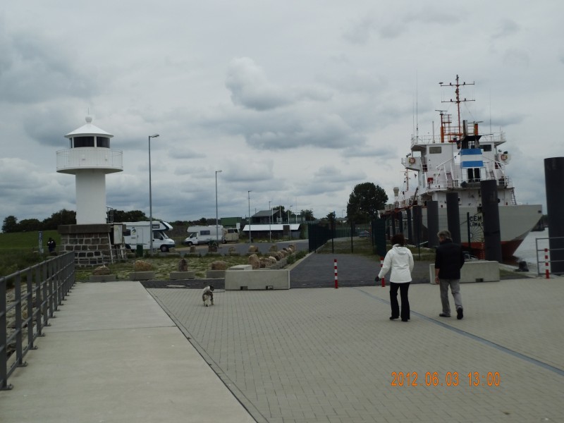 V/E gibt es dort immer noch nicht, weil es sich um keinen offiziellen SP handelt. Ein weiterer Grund ist sicherlich darin zu sehen, dass der Platz im Überflutungsgebiet im Vordeichgelände liegt. Ich bin den SP am 02.05.2012 angefahren mit dem Ziel dort zu übernachten. Hatte bereits die fälligen 5,-€ in einem Umschlag in dem Kasten hinterlegt. Am Kai stand ein Frachter auf dem sich absolut nichts tat, außer das dessen Maschine lief. Es sind ja höchsten 10 m Abstand bis zur Liegestelle.