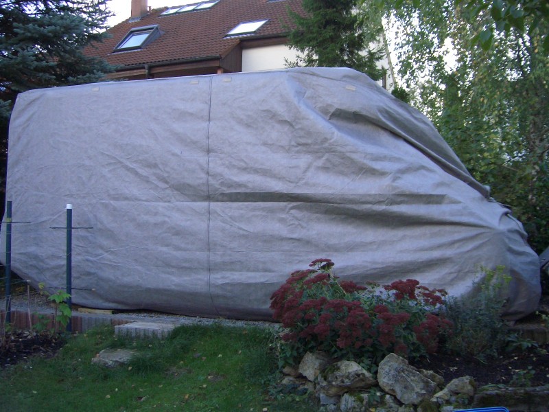Beiträge von 2010 Die Dachhaube ist von der Fa H...mann, innen wattiert immer noch Pfennig ganz und in 10 Minuten übergezogen. Beschreibung: Man lege die Abdeckhaube so hin, daß das Heckteil vor dem Frontstoßfänger liegt, mit der Außenseite nach außen, binde an die Ösen der Abdeckhaube je links und rechts einen Besenstiel oder eine Dachlatte, nehme natürlich zu zweit je einen in die Hand, hebe damit die Abdeckhaube an, gehe am Fahrzeug (Womo) links und rechts so weit entlang bis man am Heck angekommen ist, senke die beiden Besenstiele und fertig. Steht alles schön in der Beschreibung. Da ich vor dem Abdecken meines Wohnmobils immer eine gründliche Wäsche mit nachherigem einwachsen und polieren alles gerichtet habe, sind mir Lackkratzer fremd, zumal wie schon beschrieben die Haube innen wattiert ist. Über die Dachhauben und Fenster kommt vorher noch eine mitgelieferte selbsthaftende Folie.--> Link Hurra habs jetzt geschafft , hier die Bilder zu meinem Beitrag: