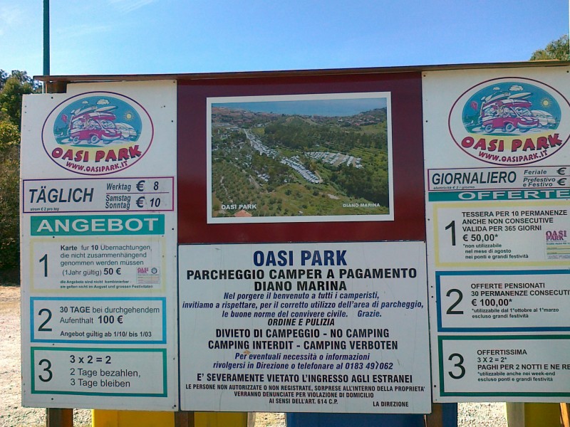 Zum anständigen Urlaub gehört für uns Strand und Meer. Da wir zwei Kinder (6 und 9) an Bord haben, möchte ich halt ungern den Platz häufiger wechseln, da wir mit An.- und Abreise ja genügend Kilometer fahren. Preislich sind für drei Wochen 50 Euro täglich in unserem Budget vorgesehen. @Meier: Danke für die Info. Das hört sich gut an. Google Maps bietet zwar eine ordentliche Ansicht, aber deine Auskunft ist doch hilfreich. Hast Du eventuell noch mehrer Fotos von dort? LG Ralf[/quote] Dann haben wir ja die gleichen Präferenzen :wink: Ich bevorzuge in meinem Urlaub auch Baden und Meer -> Ich kann auch gar nicht anders , denn sonst bekomme ich mit meinem" Gefolge "Ärger :lol: PS. Auch in der Hauptsaison ist der Platz gegenüber einem CP um einiges billiger :!: Hier noch nein Paar Fotos -> (alle von mitte Oktober ) .. Promenade - Diano Marina