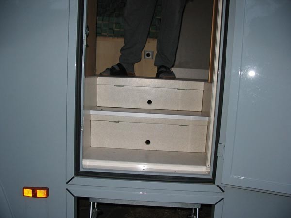 Beim Sprinter kann man unter den Doppelten Boden nochmal ein Fach bauen.Das ist hinter der großen Klappe. Da passen bei uns gerade drei Curverkisten nebeneinander hinein für kühl zu lagernde Lebensmittel wie Obst und Gemüse. Darüber auf halber Höhe der Klappe, beginnt der doppelte Boden. Da passt bei uns die gesamten Campingmöbel und sonstiges hinein. Ganz hinten ist der Hintereingang der Garage, da stehen bei uns ein oder zwei Gasflaschen drin. Da passen aber auch noch Gepäckstücke hinein. Auf lägeren Reisen haben wir da geschlossene Kisten mit Wäsche stehen, die wir irgendwann mal gegen schmutzige Wäsche von oben tauschen.
