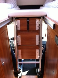 Jetzt zur Treppe, ich glaube immer noch das die aus Metall ist! Das für und wieder wurde hier ja schon ausführlich besprochen! Das Teil ist super zum auf und absteigen, stört aber ungemein beim anziehen! Wir hatten keine Lust immer zum öffnen der Schränke das Teil hochzuschieben! Umgebaut geht nun beides! Die Treppe wird, wir haben die Frontscheibe im Fahrerhaus immer verdunkelt, nun einfach mit einer Hand nach vorne geschoben, Schränke gehen wunderbar auf!