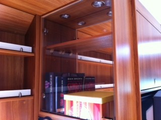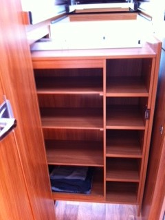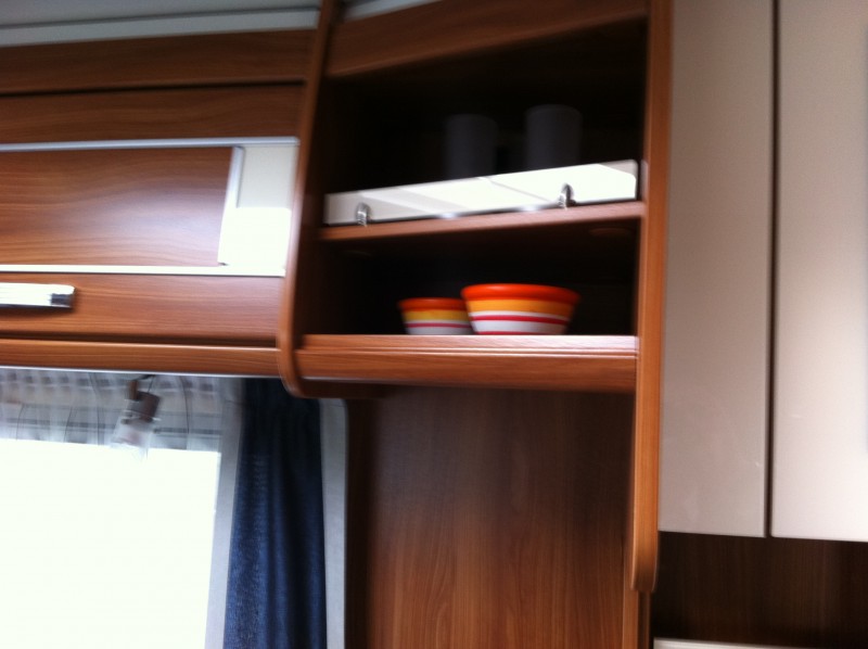 Nun noch zu den Schrankklappen. Leider habe ich hier kein vernünftiges Bild vom Lieferzustand! Alle Klappen, die meisten kenne ja die Bilder, hatten so beige Einlagen drin! Gepaart mit den Thronpolstern sah es aus wie im Altersheim! Hier wurde uns von Dethleffs aber ganz toll geholfen!! Da wir bei unserer Bestellung noch schlichte Klappen gesehen und bestellt hatten, wurden diese von Dethleffs ausgetauscht. Alle die jetzt bestellen wissen ja wie sie aussehen und haben dann nicht so eine Überraschung.