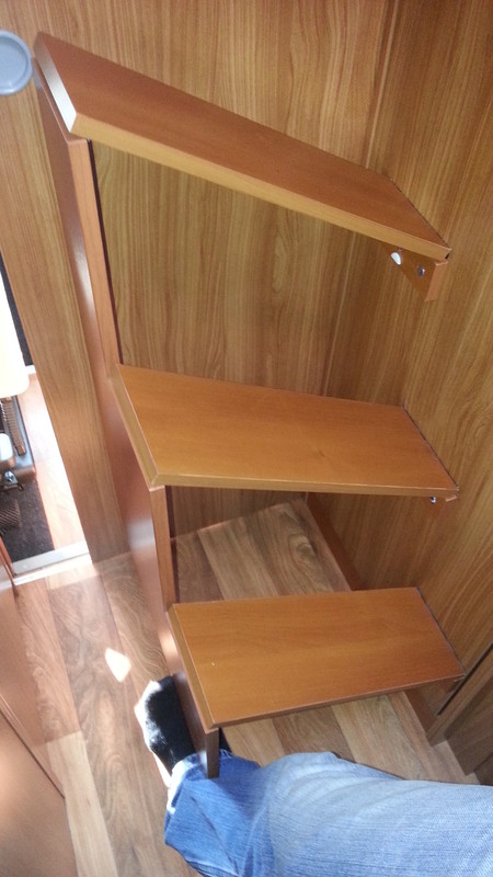Super Susanne, eine clevere, praktische und schöne Kostruktion. Einzig hätte ich die Sorge, da es an der Schranktüre befestigt ist, das die Gängigkeit bzw. die Scharniere der Türe leiden. Ehrliche Meinung?? Ich hätte Angst, dass die Tür des Kleiderschranks ausreißt. Außerdem sehe ich - beim besten Willen - keinen Vorteil zu der Originalleiter. Aber wahrscheinlich verstehe ich vom Grundsatz her nicht, was man gegen diese Originalleiter einzuwenden hat. Uns gefällt sie und wir finden sie praktisch. Guten Morgen, saubere Arbeit!!! Wer hier nicht den Vorteil erkennt, kann ruhig wieder für Bilder gesperrt werden :mrgreen: Und da auf der Schranktür kein "Zug" ist, dass Gewicht wird ja auf dem Boden abgestützt, denke ich auch nicht das die Schranktür leidet! Die Idee stammt ja eigentlich von Bimobil, die wissen schon was geht! Und noch einmal zurück zur Originaltreppe, die war gut gemeint, ist aber für den täglichen Einsatz ein totaler "Krampf". Allerdings liebe Rena, wenn du sie so gerne hast, ich habe noch eine komplette Ausführung im Keller stehen :D Kannst Du gerne als Ersatztreppe haben!! Wünsche Euch ein wunderschönes Wochenende!!