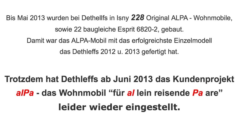 Der neue Alpa wird nicht rauskommen, die Lizenz wurde von dem Ehepaar an Dethleffs im Jahre 2013 verkauft, man könnte nur noch den Schriftzug dazukaufen (soweit wie ich es verstanden habe) für den Dethleffs Esprit 6820-2, dann wird an einem neuen gefeilt siehe Link --> Link Wo ich schon wieder Angst habe, dass man evt. zu viel Verschlimmbessert!!! Uns ging es immer so, wenn uns wirklich etwas gefiel und nicht zugeschlagen haben, wurde es überarbeitet bis es uns in der neuesten Version absolut nicht mehr gefiel. Kann mir eigentlich jemand erklären, warum Dethleffs das Modell nicht verbessert sondern gleich einstellt. War doch lt. Aussage der Homepage das erfolgreichste Einzelmodell (von Dethleffs natürlich) , Christian Ich habe in meinem Leben auch viel Geld ausgegeben für Sachen die man nicht unbedingt benötigt. Spaß gemacht haben sie trotzdem und tun sie teilweise heute noch. Nur schon gleich nach jedem Kauf stand garantiert um de Ecke wieder was neues was mir noch besser gefallen hätte...vielleicht auch besser war! Ich bin aber heute noch froh, dass ich mich damals so entschieden hatte! Die Entscheidungsfindung und den letzten Klick zum Kauf, kann euch keiner nehmen. Aber was lange gärt wird nicht immer gut! Der Alpa, oder 68.....a wie er jetzt heisst ist es aber........ für meine Belange! :ja: Und er wird immer besser, übrigens auch die 3ltr. Maschine. :ja: Wenn ich so in manchen anderen Tröds der Glaubensgemeinschaften " Ford" z.B. lese, dann bin ich froh einen frontangetriebenen popeligen Ducato zu haben. Und über die Lattenverhaue zu lästern ist nicht meiner Meinung nicht angebracht. Es laufen neben den Torfgemeinschaften auch noch mindesten genauso viele trockene alte Schätzchen auf den Bahnen. Reden wir mal in 10 Jahren über die Kunststoff oder Gfkverklebungen. Nicht alles was früher gebaut wurde war und ist schlecht...sieht man ja an mir! :roll: