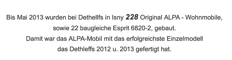 moin, wer noch einen gebr. sucht, "Alpa-number-one" steht wohl in kürze zum Verkauf. Dann muss er seinen eigenen Club kündigen, obwohl seine Jünger nehmen ihn bestimmt als Ehrenmitglied ohne Alpa auf. Allerdings war man ja vehement gegen Doppelmitgliedschaften dort. Jürgen Jürgen, von welcher Sekte sprichst Du? :D , Christian :daumen2: :daumen2: :daumen2: Jürgen ups, die Post war da. Neueste Ausgabe liegt aufm Tisch, aber noch nicht viel neues. Ausser Selbstdarstellung und Fotos vom Alpa kaum Neuigkeiten. Aber es wird ein HÜMER-I-ALPA. Jürgen Och Manno.......... nun wollte ich die erste sein, die die News verkündet. pm Seite 56!! Aber die Fotos sind doch toll von den beiden aus Bergzabern. jo, die lachen sich kaputt. Über wen wohl????? Jürgen Und das gleiche Gesabbel wie damals :argue: Nur jetzt habe ich eine andere Sichtweise. ... die Zusammenarbeit laufe "superideal" und ... sind begeistert von der Professionalität, dem Aufwand und dem Enthusiasmus, mit dem man beim Partner Hymer ihre Ideen aufgreift. Das habe ich damals bei Dethleffs auch gelesen. Hat denn einer noch die pm von damals? Mal schauen was Concorde zu diesem Artikel sagt. Zitat: Weil die Frost- und Frusterfahrungen auf der Seiser Alm eben nicht eine typische Reisemobilkarriere einleiteten, die die Schleinkofers vor fünf Jahren zu einem bald wieder veräußerten Concorde-Liner führte. Bin gespannt wie lange die Zusammenarbeit diesmal hält. Ich freue mich schon auf die Transparente der Konkurrenz (Messe in Düsseldorf). , Christian P.s.: Ich wusste gar nicht, dass sich der AlPa 300 Mal verkaufte. ![]() Ich finde die Selbstdarstellung der " Erfinder " unerträglich und unglaubhaft. Die ach so neue Erfindung gibt es doch auch schon lange. Genau wie den Grundriss des Alpa . Warum tut sich das Hymer nur an ? Wenn die "Erfinder" wieder nur auf die Möbel und die Gardinen schauen kann Hymer als technisch kompetenter "Partner" bei der Balance der Massen gegensteuern. :D At Entdecker .....welches Al.... Forum ? ......die sind doch alle hier..... :roll: Meiner Ansicht ist er genial. Er hat wovon alle Träumen, über ihn wird geredet! So viel wie über keinen anderen und Hymer macht sich zwar mA bisschen lächerlich, aber sie kommen so auch wieder ins Gespräch und ich könnte mir Vorstellen das sie sich mit dem Mobil mal richtig Mühe geben, weil, es wird, mA auch sehr bekannt werden und in vieler Munde sein. Von dem können sie es sich fast nicht leisten suboptimal zu bauen. Leiden kann ich trotzdem nicht! So von der Beschreibung her ist das neue Hymer-Duo-Mobil so ähnlich konzipiert wie der neue Frankia (Modell hab ich vergessen, stand auf der Essener Messe). Das hatte auch solch ein tiefes Hubbett und ich hab dem Verkäufer noch gesagt, dass das aber bei manchen vorsichtigen Womo-Fahrern nicht so gut käme, weil ein Notstart dann unmöglich wäre. Der Verkäufer meinte, auf CPs könne man das Hubbett ja auch immer unten lassen - da wäre ja nie Gefahr!! Nun gut!! Wenn er meint!! Ich habe es so richtig vor meinem geistigen Auge, wie sich der Herr aus Bad Bergzabern die Hände reibt. Weil wir alle so blöd sind, und hier Werbung für ihn machen. Lasst uns aufhören,über ihn zu schreiben, sondern uns mehr darauf freuen, dass es hoffentlich bald einen neuen Tröd zum neuen Mobil gibt. Dann kehrt hier vielleicht auch mal Ruhe und Sachlichkeit ein. Zur Unruhe hat er schliesslich- nicht nur hier- mehr als zur Genüge beigetragen. Er hat nicht den Hauch von Aufmerksamtkeit verdient. Aber eines muss man ihm lassen, er Aufbau ist jetzt holzfrei und das finde ich gut. Jetzt bin ich noch gespannt was für ein Fahrzeug drunter steckt und wieviel Zuladung möglich ist. , Christian Das Duo-Mobil kommt vielleicht gleich mit Vollluftferung auf den Markt. Und möglicherweise ist es auch hochwertiger als AlPa. LG Jutta Na ja, es kann doch nur besser werden, oder?? Denn wo Hymer draufsteht, wird wohl kein Dethleffs Alpa drunter sein...