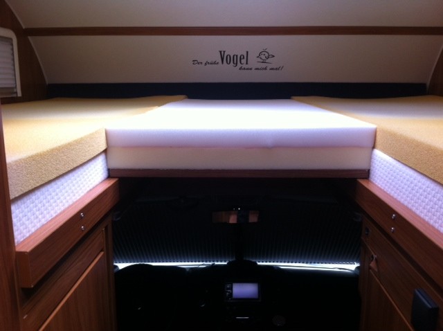:gut: Eine Bitte : diesmal vl die Fotos ein bissi "größer" ... :D Seh nicht mehr soo gut ... :oops: Und mache auch ordentlich Licht... :D Wir schlafen doch im Dunkeln!! Wenn ich Licht anmache kann ich nicht schlafen!! Im übrigen liegen wir mit den Füßen in Fahrtrichtung, vorne im Alkovenbogen ist es uns zu eng. Bild 1: Neues Mittelteil mit durchgängiger Matratze ( mit Kaltschaumauflage)/ Leiter wurde schon entfernt ![]() Und wie kommst du bei deinen Gebrechen da hoch? Pflegedienst? Neue Leiter 1: ![]() Leiter während der Fahrt: ![]() Fertig! Mit einem Griff hat man die Leiter aus Schrank geholt. Wir sind jetzt zufrieden und glücklich! Die alte Treppe war für uns eine Fehlkonstruktion