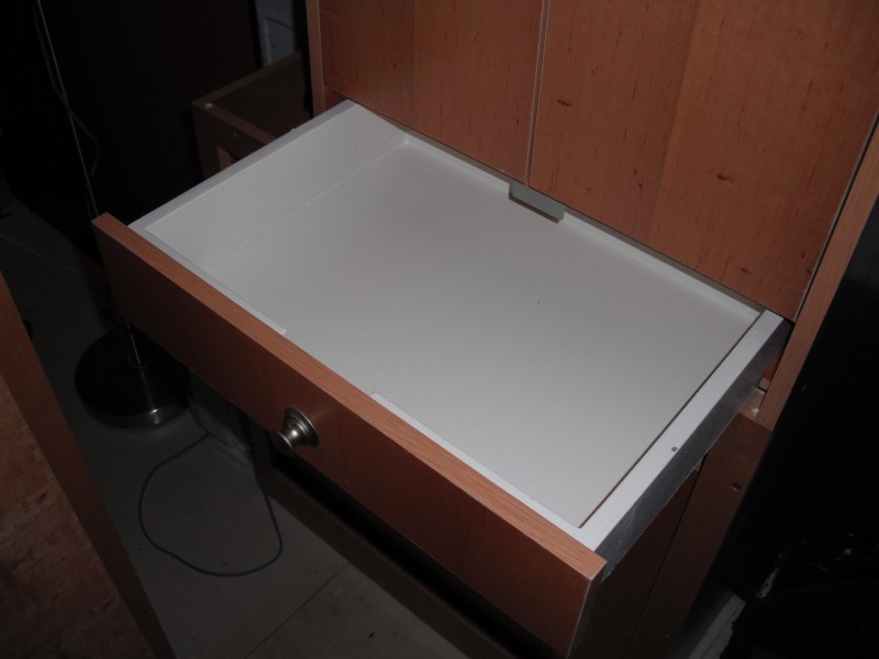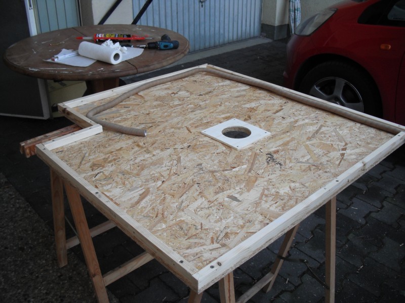 Haben das Bad angefangen, wir haben einen Rahmen gebaut darauf die Platte geschraubt, den Schlauch für die Fußbodenheizung befestigt, durchgebohrt für den Ablauf und den Ablauf befestigt. den Heizungskanal unter dem Tisch fertig gemacht, und die Seitenverkleidung der Schiebetür angefangen, wäre fertig wenn mir nicht der Lack ausgegangen wäre. :( . Im Bad haben wir sogar ein Fußbodenheizung eingebaut. Und der Schubladen ist auch fertig.