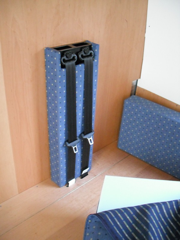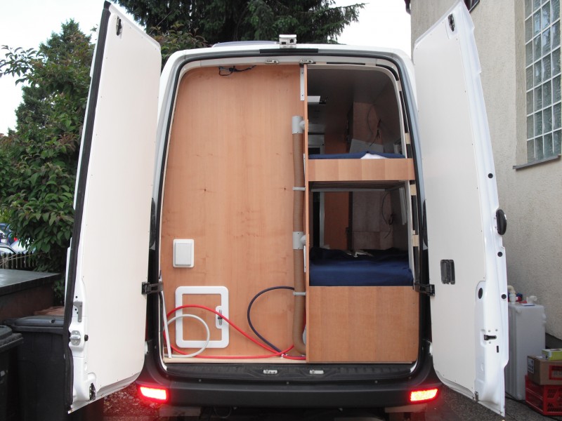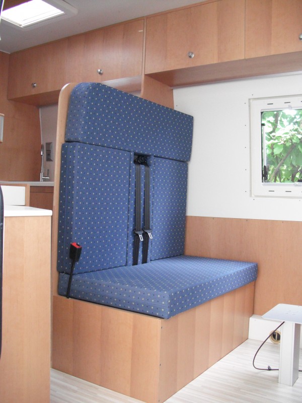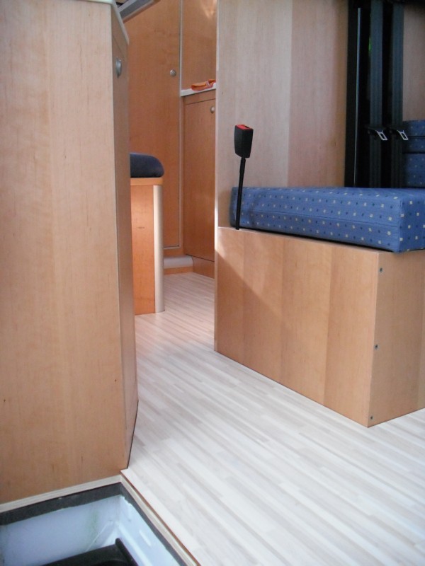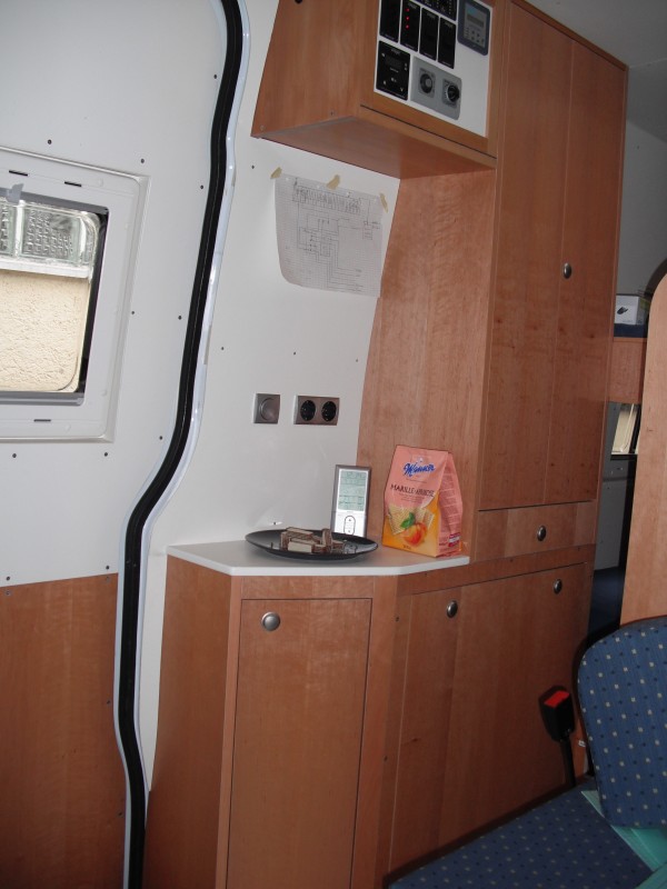 so und nun ein paar fotos von der einrichtung im fast fertigen Zustand, mit Kleinigkeiten beschäftigen wir uns nach dem Tüv. der gaskasten, davor der selbstgebaute ( wie alles andere auch) Eckschrank.