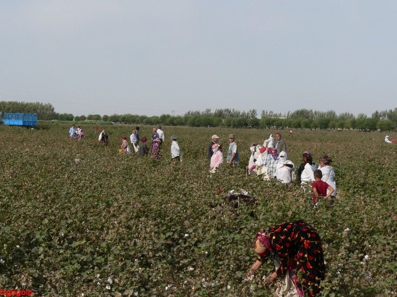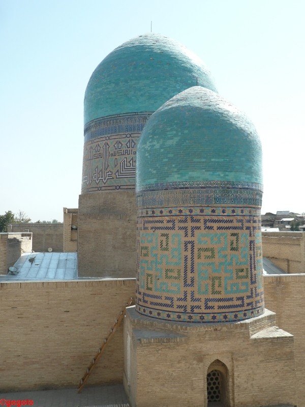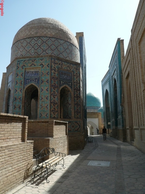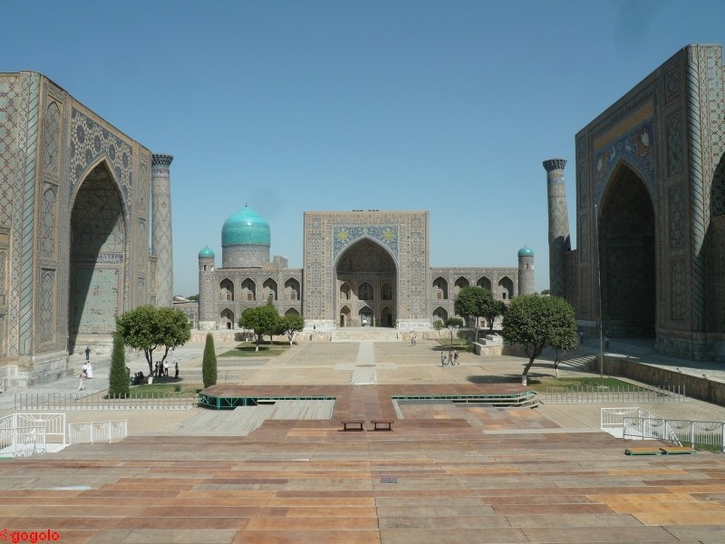 Durch das grüne Fergana-Tal fuhren wir am nächsten Tag in die Hauptstadt Taschkent. In manchen Reiseführern wird das Fergana-Tal als ein „muss“ angesehen, aber so spektakulär haben wir es nicht empfunden, insbesondere wenn man gerade aus Kirgisien mit diesen herrlichen Landschaften kommt. Das Fergana-Tal ist halt die einzige große, grüne Lunge Usbekistans mit vielen landwirtschaftlichen Flächen. Die Highlights Usbekistans sind halt die alten Städte auf der Seidenstraße. Taschkent selbst ist total modern, wurde es doch im April 1963 von einem gewaltigen Erdbeben fast vollständige zerstört. Auf der Fahrt dorthin war auf einer Passhöhe ein großer Stau wegen einer Polizeikontrolle mit Registrierung. Und bei der Abfahrt vom Pass fuhr das Gogolobil etwas zu schnell (statt 50 wurden 62 km/h geblitzt) und die Polizei stoppte uns schon wieder. Nach einigem Hin- und Her kamen wir mit 10€ (Euro wohlgemerkt) Schwarzgeld für den Polizisten mit einem blauen Auge davon. Das mit dem Euro war sein Vorschlag unter zwinkern mit dem rechten Auge… Die weitere Strecke führte uns auch direkt durch einige schöne, exotische Straßenmärkte. Taschkent (zwei Tage Aufenthalt) hat sich seit unserem letzten Besuch sehr stark verändert. Die Straßen sind breiter geworden und so manches Bauwerk steht nicht mehr sondern ist einer Bank oder einem Bürogebäude gewichen. Auffallend in ganz Usbekistan ist die außergewöhnliche Sauberkeit in den Straßen und auf den Plätzen. Da liegt kein Papier oder Zigarettenkippe herum, kein Graffiti verunstaltet die Wände von Gebäuden oder U-Bahn (in Taschkent). Selbst in den kleinen Dörfern auf dem Lande ist es sauber, wenngleich manchmal sehr staubig. Die Temperaturen betrugen übrigens in ganz Usbekistan tagsüber immer über 30°C, nachts kühlte es doch ganz schön auf rund 10°C ab. Samarkand war das nächste zweitägige Ziel auf unserer Reise. Samarkand ist meine Lieblingsstadt in diesem Land. Samarkand mit seinem wunderschönen Registan, dem Gur-Emir-Mausoleum mit dem Grab des usbekischen Nationalhelden Timur, dem bunten, großen Markt. Wobei letzterer seit unserem Besuch 2004 ebenfalls stark modernisiert wurde und seinen ursprünglichen Charakter veränderte. Ferner die alte, prächtige Gräberstadt Shohizinda. Überall sind die berühmten Kuppeln mit den blaugrünen Kacheln zu sehen – dazu ein strahlend blauer Himmel. Wuchs früher noch Gras zwischen den Kacheln auf den Kuppeln, so sind diese heute total restauriert und glänzen wie neu. Insgesamt haben aber alle Städte durch diese Restaurierungsarbeiten Unterwegs nach Buchara war auf den Feldern die Baumwollernte in vollem Gange. Schulkinder und Studenten gehen vormittags zur Baumwollernte und winken uns beim vorbeifahren fröhlich zu. Alle sind total nett, freundlich und Fremden gegenüber aufgeschlossen.