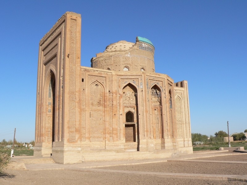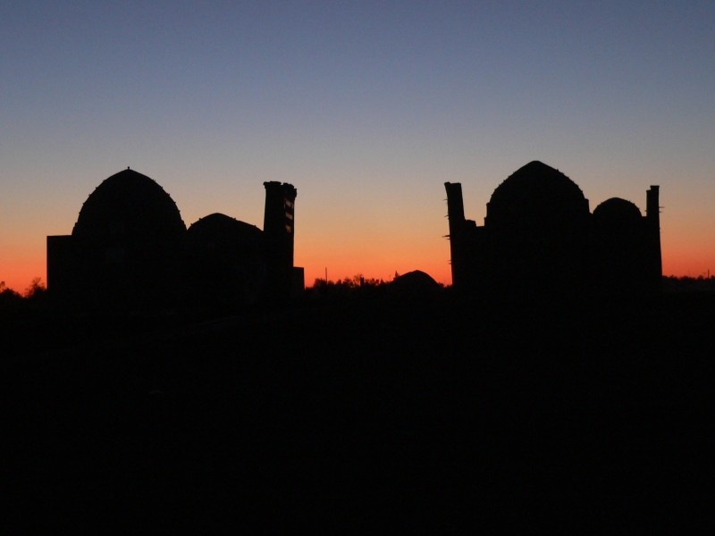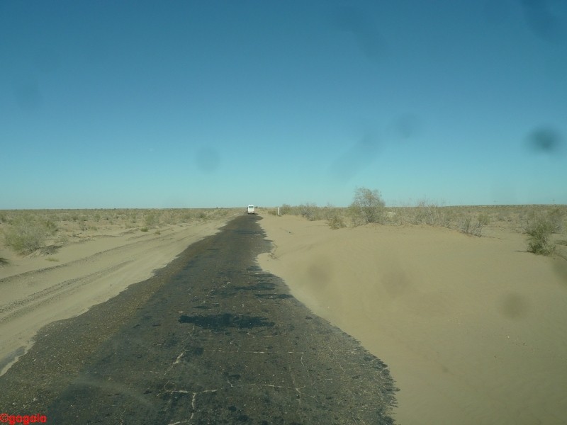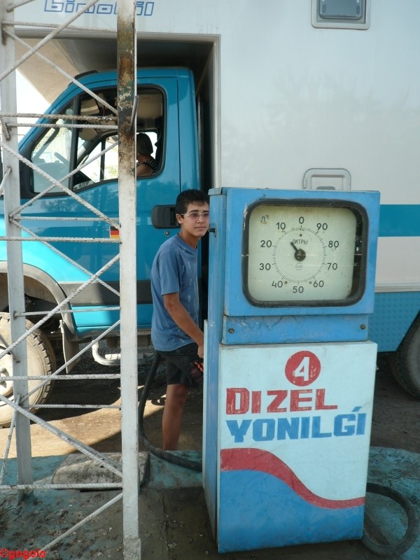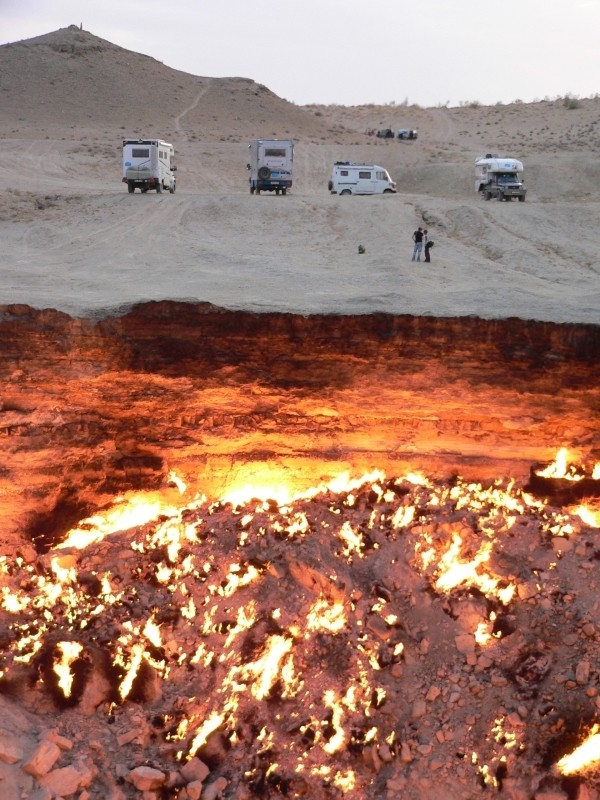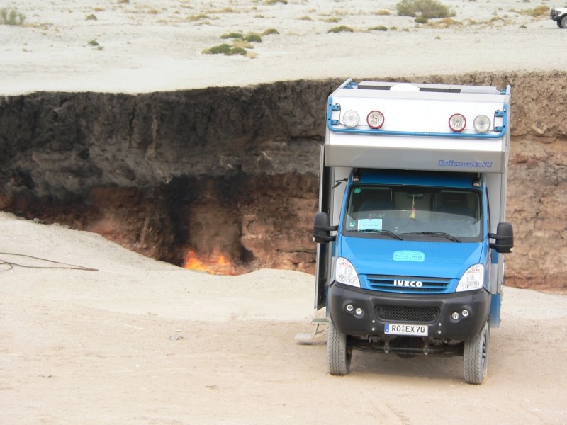 Einkaufen in den Märkten Usbekistans macht viel Spaß, auch das handeln um den Preis. Manchmal lies ich es auch bleiben, denn die Preise sind derart niedrig, dass ich mir beim handeln schäbig vorkommen würde. Mit dem usbekischen Geld ist es eine andere Sache. 2600 usbekische Sum = 1 Euro. Der kleinste Geldschein ist 1000 Sum. Beim tanken zahlten wir beispielsweise 113400 Sum, da dauert das Geldzählen dann länger als der Tankvorgang. Allerdings kostet der Diesel auch nur umgerechnet 57 €ct/Liter. Aber der große Packen usbekischen Geldes dafür ist gewöhnungsbedürftig. Zum essen/einkaufen gingen wir immer mit rund 2cm Geld um auch genügend dabei zu haben. Auch die Schäden an den Fahrzeugen häufen sich jetzt. Die schlechten Straßen und manchmal auch die Fahrweise verlangen ihren Tribut. Einige Reifenschäden sind noch das harmloseste – auch beim Gogolobil ist offensichtlich die Spur leicht verzogen und die Vorderreifen fahren sich außen etwas einseitig ab (in Taschkent habe ich daher die Reifen auf der Felge drehen lassen). Vom Rahmenbruch (zwischenzeitlich gerichtet und verstärkt) des Fahrzeugs des Reiseleiters habe ich schon berichtet, jetzt ist bei ihm noch eine Blattfeder des Nissans gebrochen. Neu ist ferner ein gebrochenes Federbein (das andere soeben auch gebrochen), ein defektes Differential, eine verschlissener Zahnriemen, eine abvibrierte Auspuffaufhängung, zwei kaputte Frontscheiben und diverse Kleinschäden durch Vibration. Bei einigen Serienfahrzeugen mit wenig Bodenfreiheit oder großen Überhängen gingen schon mal der Frontspoiler bzw. die Heckschürze zu Bruch oder die Aufhängung der Anhängerkupplung verbog sich. Auch einige Wasserpumpen der Frischwasserversorgung verabschiedeten sich ins Camper-Nirvana. Eine Windböe hebelte eine Markise aus – diese blieb dann in Westchina liegen. Von den schlechten Straßen und den Vibrationen ist auch so manches Geschirr und Lebensmittelverpackung betroffen – wir sind bislang davon verschont geblieben (den langen Federwegen und den guten Blattfedern des Gogolobils sei Dank). Der Luftfilter wurde schon bei allen Fahrzeugen gewechselt bzw. ausgeblasen, denn in den Wüsten war immer Sand und Staub in der Luft. Was die Dieselversorgung betrifft, so war sie bislang (vor Usbekistan) recht gut und günstig. In Usbekistan dagegen ist es mit der Versorgungslage etwas schwierig, da derzeit Baumwollernte ist und sämtlicher Diesel rationiert bzw. für die Erntemaschinen reserviert wurde. Trotzdem gelang es uns immer wieder an den abenteuerlichsten Tankstellen Diesel aufzutreiben. Die Qualität des Kraftstoffes ist sehr unterschiedlich. Manch einer von uns hatte schon schlechtes Diesel getankt und musste den Dieselfilter wechseln und den Tank abpumpen. Oftmals gingen die modernen Motoren deswegen auch auf „Störung“, was sich meistens aber wieder von selbst regelte. Reservediesel- und Ölfilter kamen auch schon zum Einsatz. Als nächstes lag der Grenzübertritt nach Absurdistan – oder auch Turkmenistan genannt (wer kennt schon Turkmenistan???). Und warum ich Absurdistan sage, wird deutlich, wenn ihr den Bericht über die Hauptstadt Ashgabat lest. Wenn man den Angaben unseres Reiseleiters glaubt, dann geht es hier total bürokratisch zu und alle Angaben aus den Pässen und Visa sowie Fahrzeugschein werden mit der Hand von den Grenzbeamten einzeln eingetragen. Mit langen Wartezeiten muss daher gerechnet werden, aber das sind wir ja schon gewohnt. Und es war auch tatsächlich so: drei Beamte füllten für jedes Fahrzeug einzeln die Grenzdokumente in gestochener, computerlesbarer Schrift aus, zeichneten die vorgeschriebene Reiseroute (man darf davon nicht abweichen) aus und füllten die Formulare für die obligatorische Haftpflichtversicherung aus. Zu guter Letzt wurde die Rechnung präsentiert und jeder musste auch einzeln 241 $ für das Fahrzeug sowie 10 $ pro Person bezahlen. Alles zusammen dauerte für die Gruppe mit Ausreise aus Usbekistan und Einreise nach Turkmenistan sieben Stunden. Nach Aussage unseres Reiseleiters war das relativ schnell … Der Diesel in Turkmenistan ist sagenhaft günstig: 0,16 €ct/Liter!!! Da macht tanken Spaß – ehrlich. Bei der Ausreise werde ich alles was geht und möglich ist volltanken. Der günstige Diesel ist nur möglich, weil dieser vom Staat subventioniert wird. Überhaupt bekommt jeder Turkmene Wasser, Strom, Salz und Gas kostenlos vom Staat, auch 120 Liter Treibstoff werden monatlich kostenlos abgegeben. Für das wohnen in den alten Gebäuden aus der Zeit der Sowjetunion zahlt man jährlich! nur 9$ Miete. So hält der Staatspräsident das Volk bei Laune. Aber ansonsten haben die Leute in Turkmenistan nichts zu lachen, alles ist reglementiert. Überall Polizei und Überwachung. Tempolimits werden scharf überwacht und fotografieren darf man auch nicht alles – eher wenig. Alles was eine Uniform anhat oder Gebäude, auf denen die Staatsflagge weht, Kasernen, Grenzgebiet, Flughäfen, Brücken: Fotografierverbot. Jetzt ist mir klar, warum die Welt so wenig von Turkmenistan/Absurdistan weiß. Nach der Grenze fuhren wir zu einem kleinen Ort, wo ein religiöses Heiligtum zum Besuch einlädt. Wir übernachteten am Parkplatz und im letzen Abendlicht waren die Gebäude ganz besonders schön anzusehen. Dann ging es wieder in eine Wüstendurchquerung von Nord nach Süd: die Wüste Karakum (schwarze Wüste). Gnadenloser sowjetischer Asphalt bzw. die wenigen Brocken, die davon übrig geblieben sind, machten die Fahrt zu einer echten Tortour. Selbst mit dem Gogolobil konnte ich gerade einen Schnitt von nur 35 km/h fahren, damit das Fahrzeug keinen Schaden nimmt. Erst nach ca. 100km wurde dann die Straße besser. In der Mitte der Wüste blieben wir bei einem gigantisch großen und spektakulären Feuerkrater und feierten ein kleines Grillfest. Zu diesem Feuerkrater gelangte man von der Hauptstraße aus über eine sehr sandige Piste, die für die zweiradangetriebene Weißware total ungeeignet w