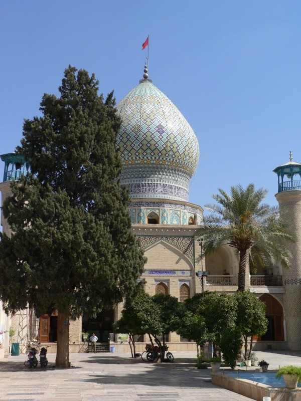 Auch weiterhin ging die Fahrt immer wieder durch trockene Wüstengebiete, die aber durch Grundwasserpumpen (Diesel kostet im Iran fast nichts) stellenweise bewässert werden und dort werden auch neben den obligatorischen Pistazien auch Feigen, Granatäpfel und Mais angebaut und auch sonst Ackerbau und Viehzucht betrieben. Oberhalb eines großen Salzsees auf 2000m übernachteten wir in einem Feigenhain mit gigantischer Aussicht auf diesen blendend weißen Salzsee. Natürlich wird das Salz auch abgebaut und stapelt sich am Rande des Sees. Den stimmungsvollen Tag rundete ein schönes Lagerfeuer ab. Eine kurze Fahretappe brachte uns nach Shiraz, wo wir einen Tag vor der restlichen Gruppe eintreffen und uns einen Ruhetag gönnen. Wir stehen fast mitten im Zentrum in einem schönen Park, der zu einem Hotel gehört und haben hier alle Annehmlichkeiten (Strom, Wasser, Duschen) eines Campingplatzes. Da wir bei den Ersten waren, die eingetroffen sind, haben wir auch die schönsten Stellplätze im Schatten der Bäume. Ein Wermutstropfen ist allerdings auch dabei, denn ein Mitglied unserer Gruppe ist schwer erkrankt und muss auf dem schnellsten Wege nach Hause gebracht werden. Der chaotische iranische Straßenverkehr forderte ein weiteres Opfer: einem Gruppenmitglied wurde die hintere Stoßstange weggefahren – sie wurde aber wieder provisorisch für den Rest der Reise angebracht. Ferner fuhr ein Motorradfahrer einem anderen Gruppenmitglied beim Rechtsüberholen in die Aufbautüre – nur eine kleine Delle im Womo. Hatte ich bisher gedacht, dass der Straßenverkehr in Peking und Xian durch nichts zu toppen ist, so habe ich mich kräftig geirrt: der Straßenverkehr im Iran (insbesondere in Mashat und in Shiraz) ist noch viel unbeschreiblicher. Man muss hochkonzentriert sein und auch mal auf die Vorfahrt verzichten um eine Kollision zu vermeiden. Besonders ist auf die Moped- und Motorradfahrer zu achten, die jede Lücke gnadenlos zu ihren Gunsten auszunutzen versuchen und sich durch die schmalsten Lücken vorschlängeln.
